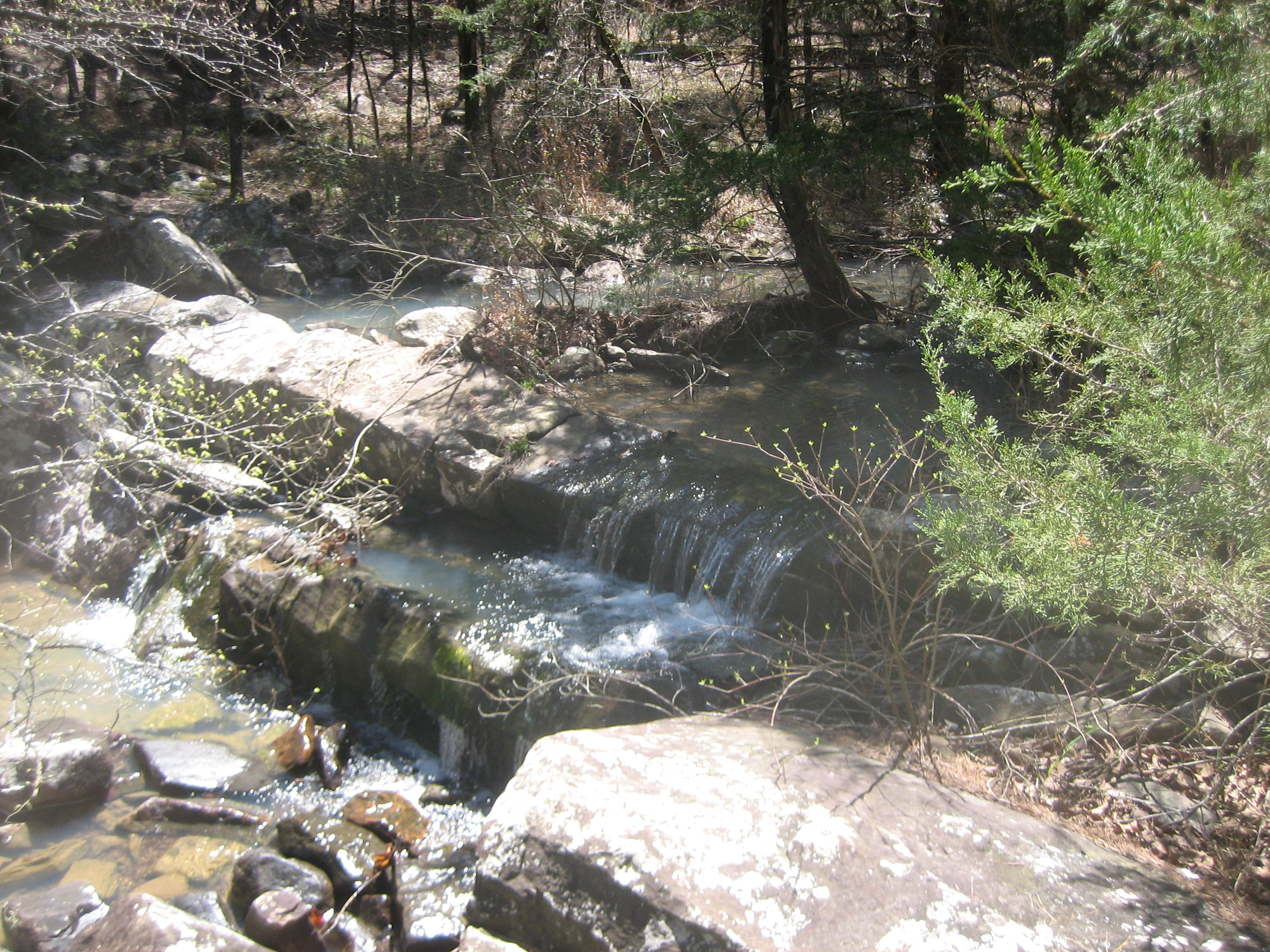This 22.1 mile loop combines the first section of the Ouachita Trail with two prominent trails in Holson Valley, the Boardstand and Old Military Road Trails. It is probably the best hike in Oklahoma providing a sampling of the OT without the need for a shuttle. The Map: A free full size version of the map is available on the right as a downloadable jpg. It is also available printed in color on 11x17, "Rite in the Rain” all weather writing paper for $5 plus S&H by emailing Charlie at cew5151@gmail.com. The map is nominal 1:24,000 based on USGS 7.5 minute quadrangle topographic maps. The Loop was mapped with a WAAS enabled GPS and is drawn in different colors to designate each trail. Also shown is the Choctaw Nation Trail (yellow), other trails and forest roads not shown on the standard quads. Other features include trailheads, segment mileage, general directions to park, waypoints and waypoint coordinates. GPS File: Right click this link to download the track in a gpx format. Save it to your computer and use your GPS software to load it to your GPS. Google Earth Track: Right click this link to download the track in the Google Earth kml format. Save it to your computer, and open it in Google Earth and trace the route in interactive 3D. Background: Situated in the rugged Ouachita Mountains, the Boardstand-Old Military Road Loop offers the best 2 night hike in Oklahoma. It is comprised of 3 trails, the Ouachita, the Old Military Road and the Boardstand and, with 7 different trailheads, there are plenty of options for customizing the hike. On this narrative the Old Military Trail branches off the Ouachita just north of Talimena State Park and takes you over Winding Stair Mountain to the Holson Valley Trailhead. There it becomes the Boardstand, traverses Holson Valley and cuts south up Winding Stair to the Ouachita Trial. The OT basically runs the crest (video) of Winding Stair Mountain westward back to the state park. The Oklahoma Ouachitas can be very hot and very dry so hikers are encouraged to check about water availability with the Forest Service and cache water if necessary. The Ouachita Mountains were formed by low angle thrust faults of Pennsylvanian aged clastic rocks. The top of Winding Stair Mountain is a competent sandstone of the Jackfork Formation; the valleys are formed from eroded shale. The mountains have a maximum relief of about 1,600 feet and, in this area, reach a maximum elevation of almost 2,400 feet. The ecosystem was originally shortleaf pine/bluestem grass and supported elk and bison. Unfortunately, large-scale harvest between 1910 and 1940 changed the character of the forest. It is now mixed pine and hardwood, mostly oak and hickory, and much smaller than the trees in the virgin forest and the bison and elk are long gone. But, alas, the snakes are still there so watch out! The forest service has a restoration program to revert the forest back to the shortleaf pine/bluestem grass assemblage but it will take decades. On the upside, if you visit the forest in the spring you might be treated with the pinks of the bloomiing redbuds and whites of the dogwoods and fruit trees. The Hike: The trail begins at Talimena State Park (Trailhead #1, TH1), just off of US Highway 271 northeast of Talihina Oklahoma. The trailhead for the Ouachita Trail (blue blazes) is well marked and on the east side of the park. Camping, showers and restrooms are available. They have changed to a new system for reservations and camping at the park that relies on a mobile app. I suggest you investigate this before you arrive. If it is a hassle, park at the Holson trailhead for free. You don't need a permit on the trail and it is open camping. From the state park, head north on the Ouachita trail and enter the mixed hardwood (predominately oak and hickory) and pines of the Ouachita National Forest. At 0.7 miles turn left at the junction of the Old Military Road (white blazes) and finish the 400 foot climb up Winding Stair Mountain. Watch both ways, cross Talimena Scenic Drive and cut through the Old Military Road Vista (TH2, mile 1.6). Talimena Drive is a national scenic byway that runs along the crest of the Ouachitas from Talihina OK to Mena AR and is a fun drive (video) offering winding curves and plenty of vistas. The Old Military Road vista has a historical marker telling how the road was built by the US Army in 1832 and was used to relocate the Choctaw Indians to Indian Territory and move troops to the interior from Fort Smith. The trail heads downhill for a mile where it joins up with the Choctaw Nation Trail (formerly the Indian Nation Trail. Mile 2.5). The CNT is a 40 mile trail blazed in yellow that flanks both the north and south side of Winding Stair Mountain. For the next 11 miles, the trail will be blazed both yellow and white where it is both the Old Military Road and the CNT. The Old Military Road trail finishes its decent into Holson valley and meanders towards the east for about 5 miles until it hits the spur trail to the Holson Valley trailhead (TH3, mile 7.5). It is 0.7 mile to the parking lot. No services are available but parking is free. If water is flowing in the creeks, there is a pretty little falls about 0.1 miles north on the spur. The Old Military Road trail ends at the spur and the Boardstand Trail (also blazed white) begins. The Boardstand is so named because the Holson Valley, like the rest of the Ouachitas, was originally populated with short leaf pine trees. Easy access in the broad valley made it ideal for harvesting for lumber. While the current second growth forest is an oak pine mix, the forest service's restoration program is bringing back the shortleafs. The trail continues in a southeasterly direction and crosses Forest Road 6010 (aka Deadman Rd) after 2.6 miles (mile 10.1). After another 2.5 miles (mile 12.6) the CNT and Boardstand separate, the former heading east and the latter turning south and heading up Winding Stair Mountain. If you need to camp in this