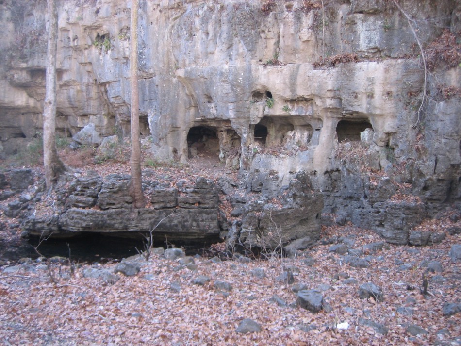 The Whites Creek Trail climbs out of the hollow and follows the bluff overlooking the river. This section of trail was quite a bit rougher than the rest of the trail. After leaving the bluff and climbing out of a hollow, the trail climbs to the top of a hill and stays there for about 1.2 miles. Next it is down hill into Whites Creek. As the trail follows the creek towards the river it passes the base of a bluff honeycombed with caves (video). I met a party near there that said there was another cave further up the bluff, but I don't know where it is. At IW-06 (mile 12.7) is a spur trail to the river and float camp.