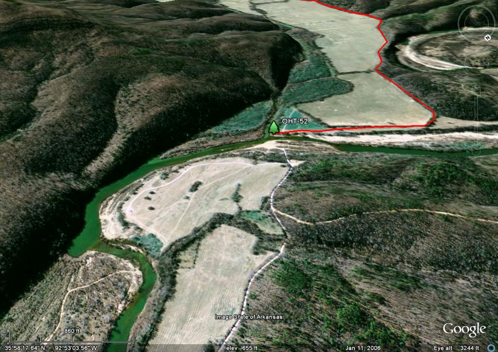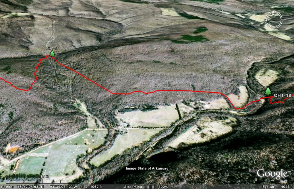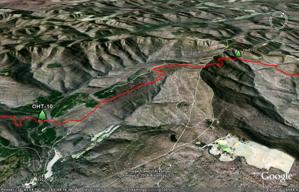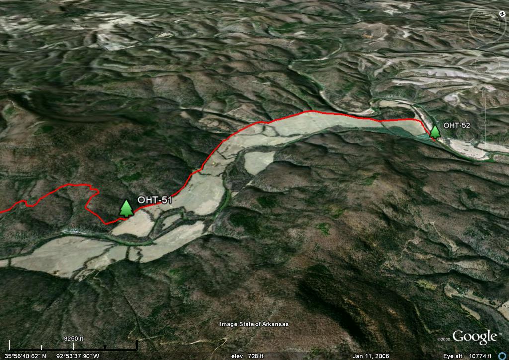 Skip the trail descriptions and jump to the topo maps NEW: The entire trail is now on Google Earth. See below. Background. It used to be said that the Ozark Highlands Trail (OHT) was 165 miles long, stretching from Lake Fort Smith State Park to Woolum Ford on the Buffalo River. Now it is a little more complicated. First, on the west end Lake Fort Smith and Shepherd Lake were combined into one, Lake Fort Smith State Park was moved 4 miles north and the old trail was flooded. A new trail section connects the new park with the existing trail in Jacks Creek. According to the GPS track we took April 17 2009, it is a mile shorter. Making it up at the other end is the east section of the Buffalo River Trail and the new Sylamore Section of the OHT. Though not actually part of the OHT, the east BRT is dozens of miles downstream from the west BRT terminous at Pruitt. The east BRT picks up where the OHT ends at Woolum and runs another 15 miles to the US Highway 65 bridge across the Buffalo River. Another 30 miles to the east as the crow flies is the Sylamore section of the OHT. Though far from being contiguous with the existing trail at Woolum, this 31.6 mile trail is officially part of the OHT. Both the east BRT and the Sylamore Section of the OHT will be part of the Trans-Ozarks Trail (TOT). When complete, the TOT will combine the Ozark Highlands Trail, the east BRT, the Ozark Trail of Missouri and many trails still to be built, to connect Fort Smith AR and St Louis MO. NEW! Trail Descriptions: The following links will give you descriptions and pictures of selected sections of the trail.