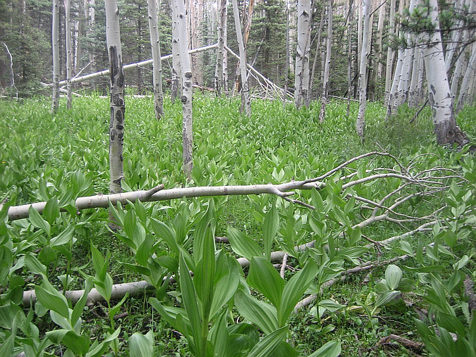 Cross the bridge over the Conejos at 0.4 miles and reach the South Fork sign (SJ-02, 0.4 miles). In front of you to the west is the open grass covered valley of the South Fork. The trail veers north, heads up a slight hill, passes a gate (0.7 miles) and reaches the junction of Trails 724 and 720 (SJ-03, 1.0 miles). Turn left and pass the Trail 724 post. For the next several miles you will hike though meadows and small sections of trees. At 1.7 miles there is a distinct trail the heads straight up a small rise towards the trees. Turn left instead on what appears to be a lesser trail and stay in the meadow heading west. In this area you will pass a pretty aspen grove covered with corn lilies.