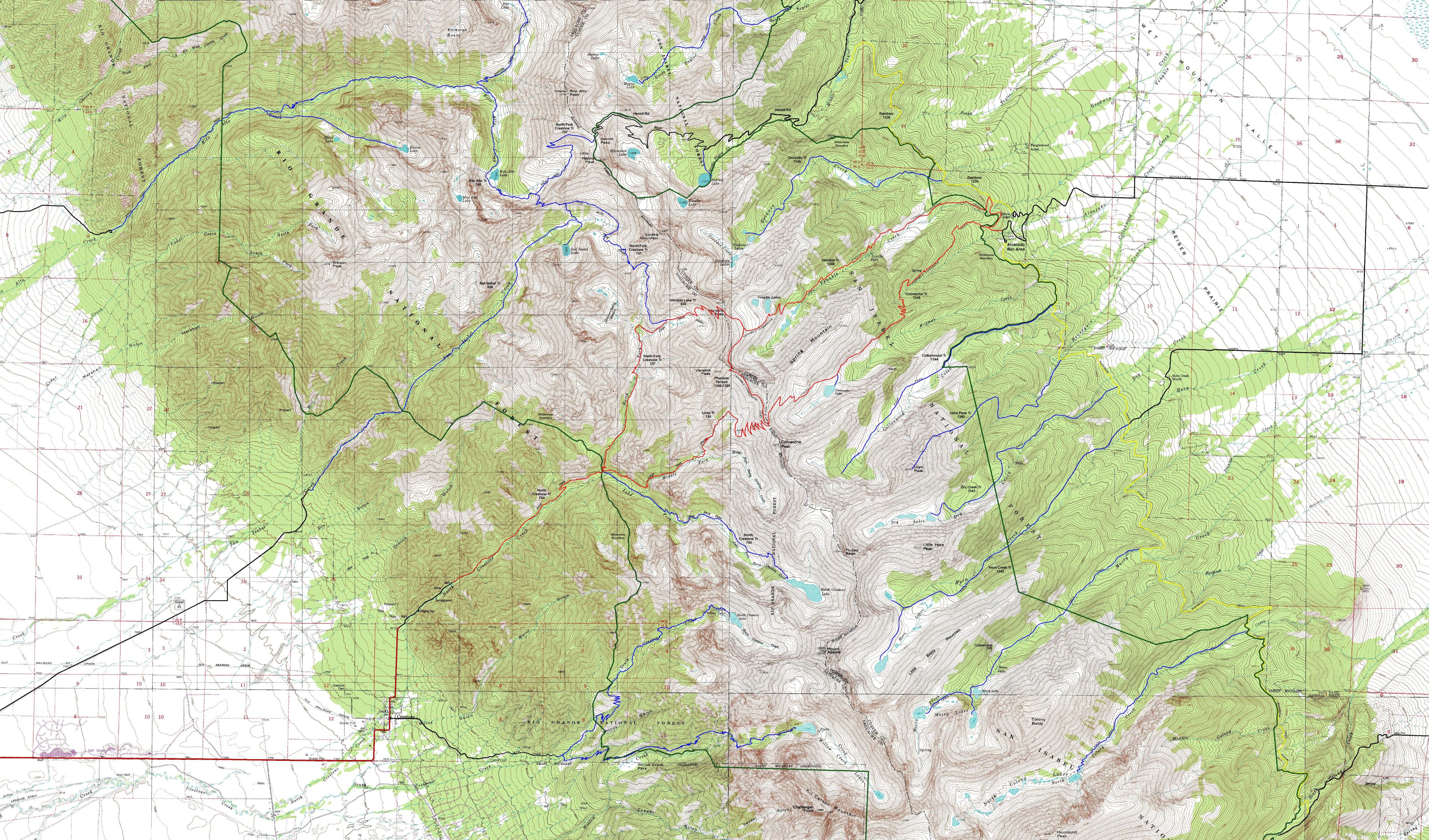 The Sangre De Cristo Mountains are a northwest-southeast trending spine in south central Colorado that features a series of northeast-southwest trending glacially carved valleys. While there are trails going up many of the valleys, these maps focus on one of the few "official" loops. There are two versions of the loop. The more popular east loop starts on the east side of the range at Alvarado Recreation Area near Westcliffe and uses the Comanche and Venable valleys to enter and exit the high country. Connecting the two, traversing the connecting ridge, is Phantom Terrace. Phantom Terrace is also the connector for the west version of the loop. It begins at Crestone Campground and uses the Middle and North Forks of Crestone Creek.