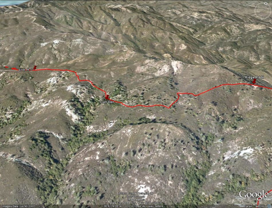 Once you reach the top of the ridge and intersect the trail to Silver Peak (mile 5.6), you are in the chaparral. There is a trail marker at the intersection; be sure you turn left (east). Going right will take you to Silver Peak. There is supposed to be a campsite near the peak, but we didn't go that way. Turn left and it is 0.4 miles to Lion Den on an old eroded forest road. The brush has not closed up this part of the trail and most of the PO disappears (though there is a bit on the trail near Lion Den).