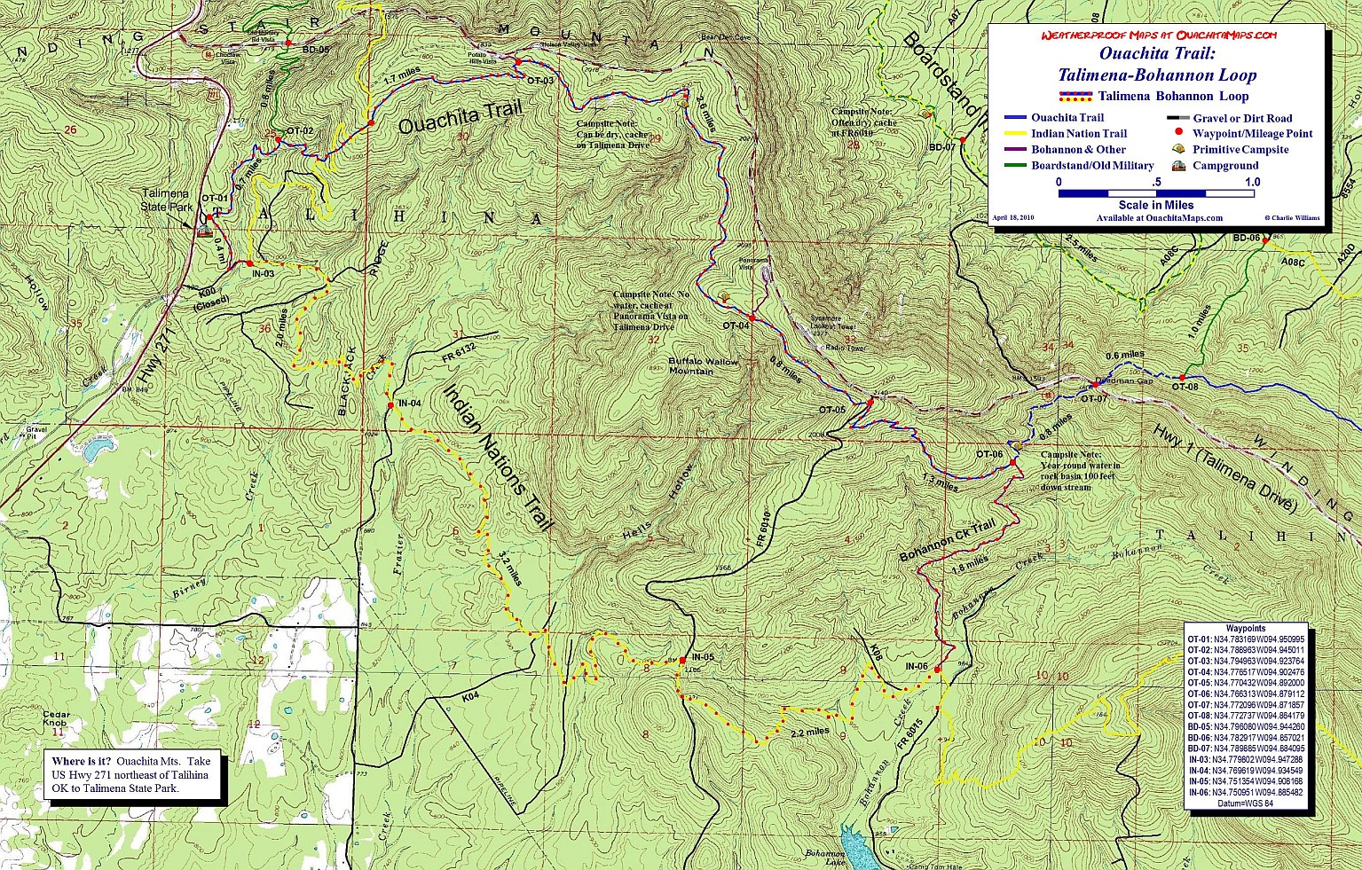 Trail Mileage: Two trail mileage tables are presented to correspond with the two trip options discussed in the narrative. Click for here for the pdf files of Option 1 or Option 2. GPS File: Right click this link to download the track in a gpx format. Save it to your computer and use your GPS software to load it to your GPS. Google Earth Track: Right click this link to download the track in the Google Earth kml format and trace the route in interactive 3D. Save it to your computer and open it with Google Earth. The Hike:While this narrative of the Talimena Bohannon Loop begins at Talimena State Park, there are numerous access points that can be used to alter your trip. They include Potato Hills Vista and Panorama Vista off Talimena Drive and several Forest Roads that cross the INT. Another possibility that will add a couple miles to the loop is the vista near Deadman Gap. Talimena State Park (OT-01), just off of US Highway 271 northeast of Talihina Oklahoma. Camping, showers and restrooms are available. Tent camping is $12 per night. Overnight parking while hiking is $5 per night payable at the envelope drop at the trailhead. You have two choices to begin the loop. Option 1 is to take the Ouachita Trail (OT) which is what I designate as the loop on the map. The trailhead is on the east side of the park by the fee envelop the drop box. The trail is blazed in blue and heads due east from the parking lot. Option 2 is to pick up the multi use trail at the southeast corner of the campground and use it to access the INT. More on this option later. Striking out on the OT, the trail will soon turn to the north and follow the east side of a small ridge. After dropping down to a small creek, it begins its 800 foot climb up Winding Stair Mountain. At 0.7 miles is the junction with the Old Military Trail. If you were hiking the Boardstand-Old Military Loop, you would head north following the white blazes. Still climbing, you will pass a series of yellow blazes beginning a 1.1 miles where INT crosses the OT several times. If your trip started with option 2, this is where you will pick up the OT. With that segue, we will review Option 2. Take the multi-use trail south from Talimena State Park for 0.3 mile to a forest road and turn left (east). Look for the INT heading up a steep hill into the woods on the left (north) after about 0.1 miles (0.4 miles total). Since we didn’t have a trail map (which is why I made this one), we weren’t sure where the trail was and walked right by it. If you get to a prominent forest road heading north, you have gone too far. Not to worry, the trail is easier to see going back to the west. One thing to watch out for on Option 2 is just before you get to the OT, the INT crosses an open area and gets lost in a brushy area. You will find a few blazes, but then they are gone. Go back to the clearing and head up hill and look for the yellow blazes just before the tree line. Take them right (east) and follow them to any one of 3 junctions with the OT. (Your trip, your choice.) Back to Option 1. At 2.4 mile on the OT, you will complete the climb and be at the spur trail for the Potato Hills Vista. The trail stays fairly level at 1900 feet up for about a mile until it crosses Frazier Creek. The Frazier Creek campsite is a spacious one tent site (you could force more) with abundant rock furniture and a big fire ring. Though water is usually available, this campsite is dry until the fall rains come. Cache water up the draw on Talimena Drive. Just after a 200 foot climb, you will pass Panorama Vista Camp and then the Panorama Vista Spur Trail at 5.0 miles. The campsite has room for several tents but is dry. Cache water at Panorama Vista. At 5.7 miles cross FR 6010. The OT heads SW along the east side of the forest road for 0.1 miles and then turns east. A more obvious trail at FR 6010 is a multi use trail that heads ESE. It is broad but has no blazes. While I suspect this will intersect the OT near the Bohannon cut-off, I have never hiked it that far. The Bohannon Trail is 1.3 miles from FR6010 on the OT. The OT continues past Bohannon Camp (a nice one tent camp site with year-round water in a rock basin down slope) and reaches Talimena Drive in 0.8 miles. Deadman Vista is just around the bend to the left (west). The Bohannon Trail is an 1.8 mile multi use trail that, quite frankly, is more like a rutted dirt road. It, however, is the key to making this a loop rather than an out and back or being dependent on a shuttle. Its other saving grace is a nice little outcrop near the bottom that overlooks Bohannon Creek. The trail intersects the INT at the bottom of the hill, which right here is using an old forest road. The INT uses yellow blazes and little yellow signs with INT stenciled on them. Go right (southwest ) for the loop. If you go left (southeast) you will intersect FR 6015 which in turn will take you to Bohannon Lake and the Boy Scout’s Camp Hale. FR 6015 can be used as an alternative trailhead for this loop. On the map, IN-05 is the waypoint where the INT leaves FR 6010. 1.1 miles later it crosses another forest road. Because of the scale of the map you can’t really tell but you need to turn right on the road and then left back on the trail. If you go left on the road, after a while you’ll start seeing yellow blazes. These are equestrian blazes which will not take you back to Talimena State Park. After crossing a small ridge at the foot of Buffalo Wallow Mt, the Rifle Range Road (FR 6132) and Blackjack Ridge, the INT intersects and follows forest road K00 (K00 is closed to cars and trucks at a barrier off Hwy 271). Stay on this past the creek, past the forest road that climbs to the north and past the junction where the INT climbs into the woods to the north (this is the area described in Option 2). Hike 0.1 miles past the INT junction, turn right (north) and follow the old road bed back to the state park. Info: USGS 7.5 minute quadrangle topographic maps: Blackjack 