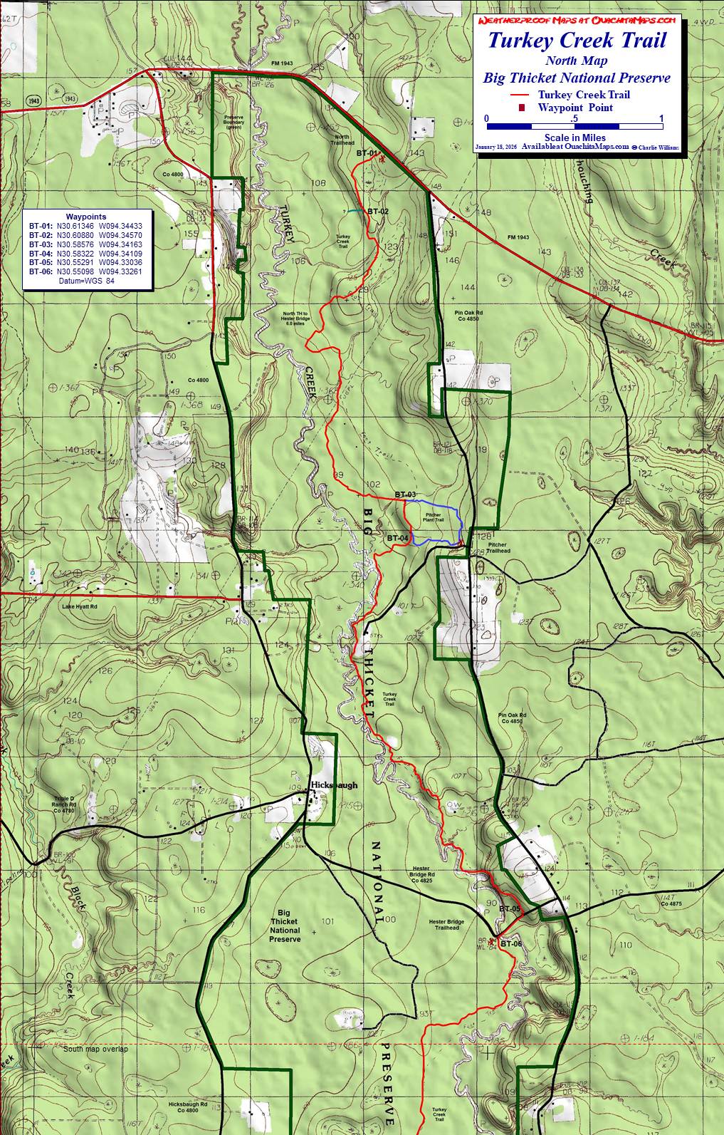 BT-05 (6.0 miles) is at the intersection of the Hester Bridge road. Turn west staying on the dirt road and cross Turkey Creek on the bridge. There is a small parking area on the west side of the bridge where the trail heads back into the woods (BT-06, 6.2 miles). No toilet or picnic tables.