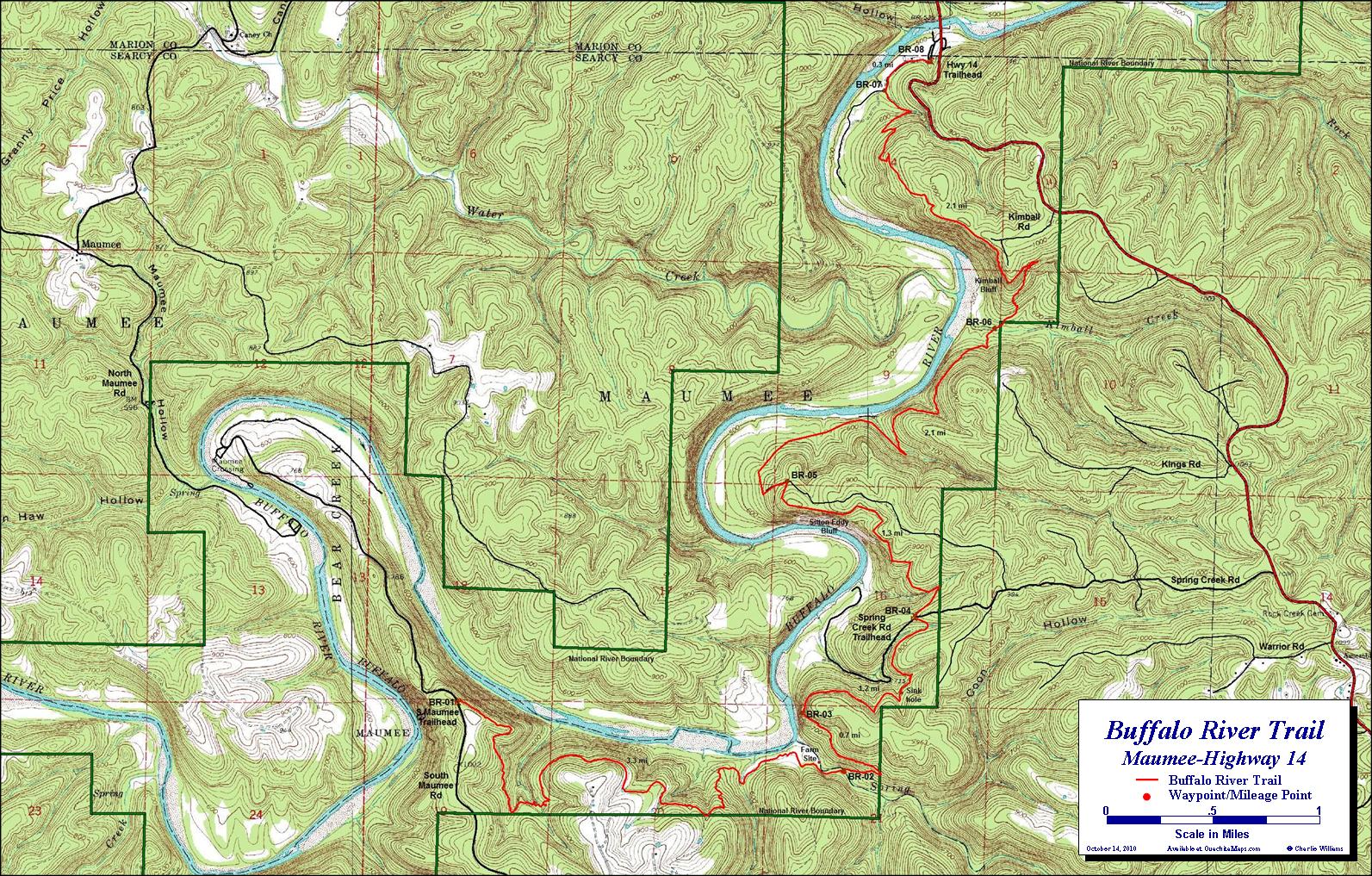 The tracks were taken in 2010 by a team consisting of Ken Smith, Bob Miller (Green Country Outdoor Club) and Rick Davis. The trail is in red and the Buffalo National River is outlined in green. Waypoints are designated with a maroon dot and labeled BR-xx. The mileages shown are between waypoints.