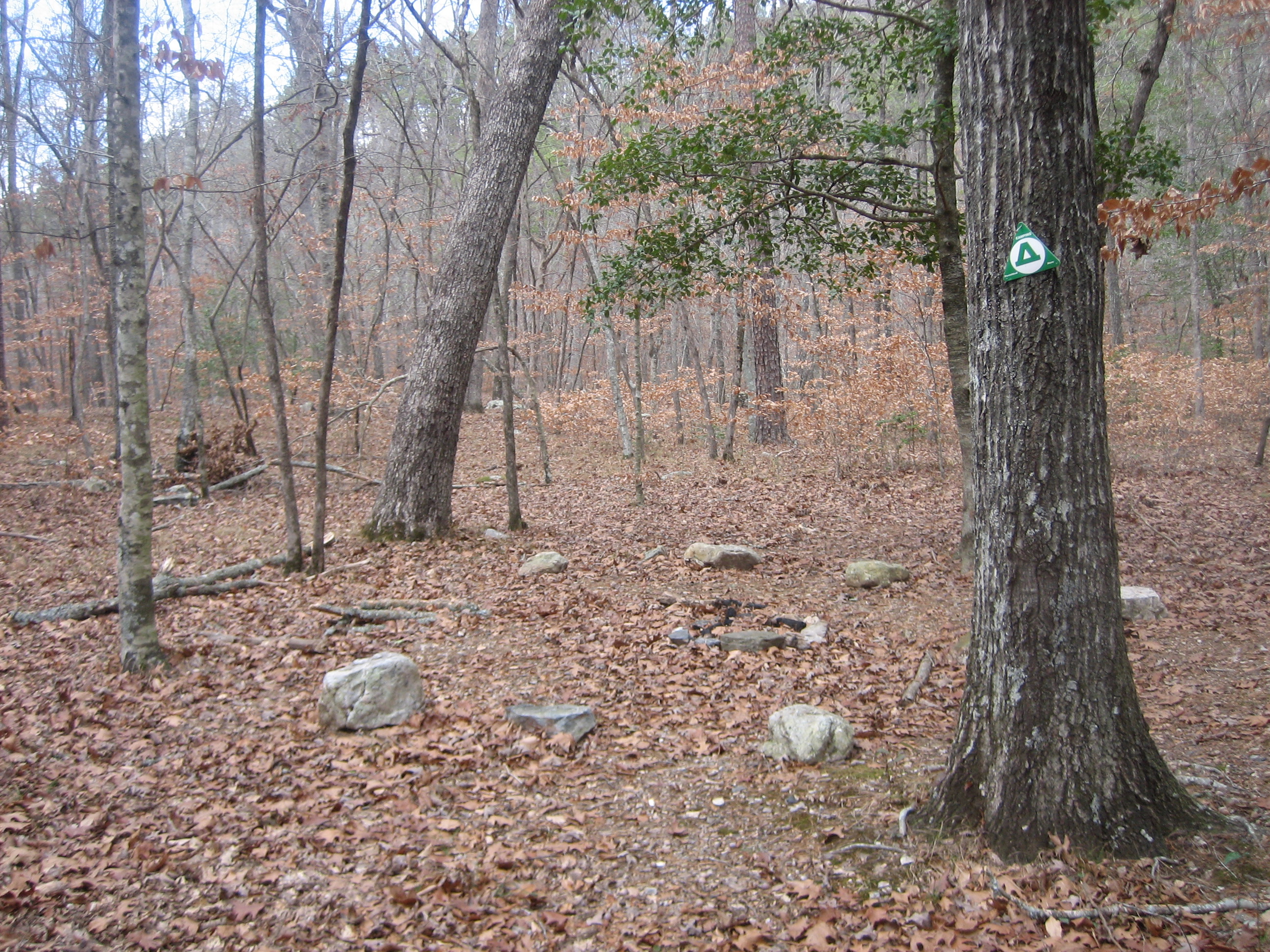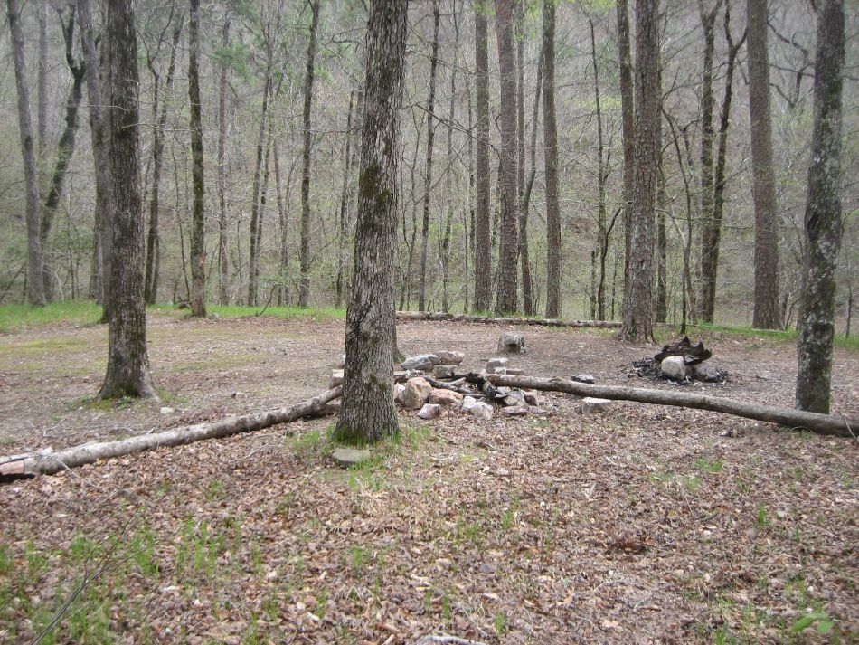 After the Buckeye junction (WP-3, N34.39527 W094.08143), the trail drops into Katy Creek and then pops up to a wooded terrace for 0.2 miles. While this area is flat and a tempting area to camp, it is marked in many places as no camping. Since the Forest Service can't mark every tree, I figure the entire area is off limits until you get to about mile 5.8. Here is a large, well established campsite on the right (south) side of the trail and there are no signs.