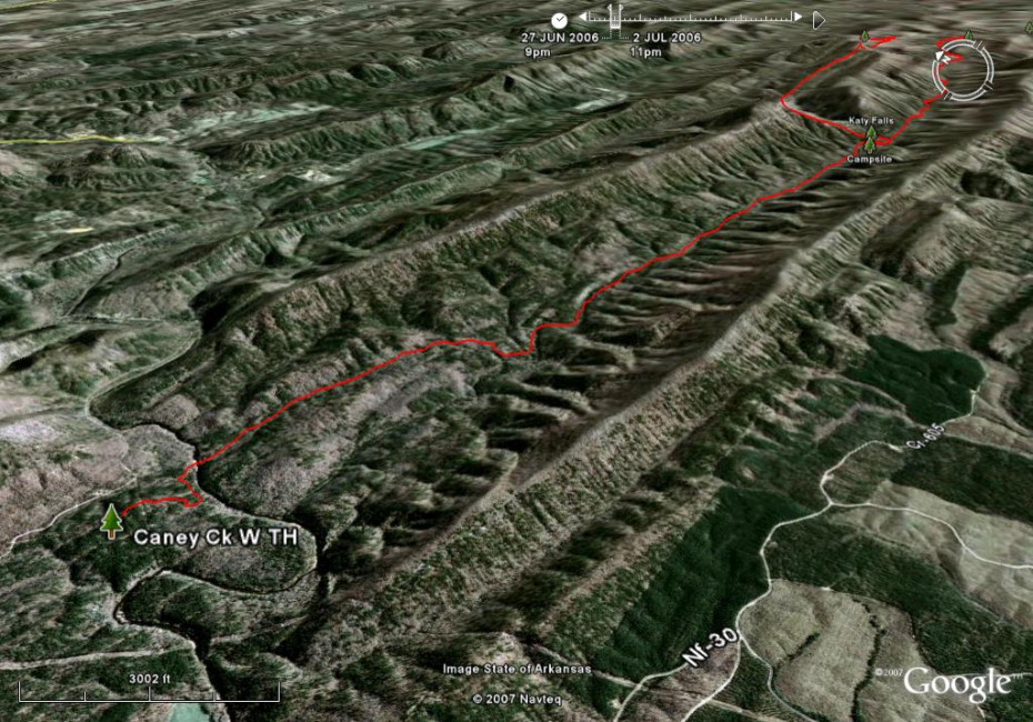 The Map: A free full size version of the map is available on this page as a downloadable jpg. It is also available printed in color on 11x17, "Rite in the Rain” all weather writing paper for $5 plus S&H by emailing Charlie at cew5151@gmail.com. The map is nominal 1:24,000 based on USGS 7.5 minute quadrangle topographic maps. The Caney Creek Trail is red, the Buckeye is blue and the spur trails are yellow. All were mapped with a WAAS enabled GPS. Other features include forest roads, trailheads, creek crossings, segment mileage, general directions, waypoints and waypoint coordinates. An inset map of the same scale is used to fit the entire Caney Creek Trail on one map. Lines show where the two maps overlap.