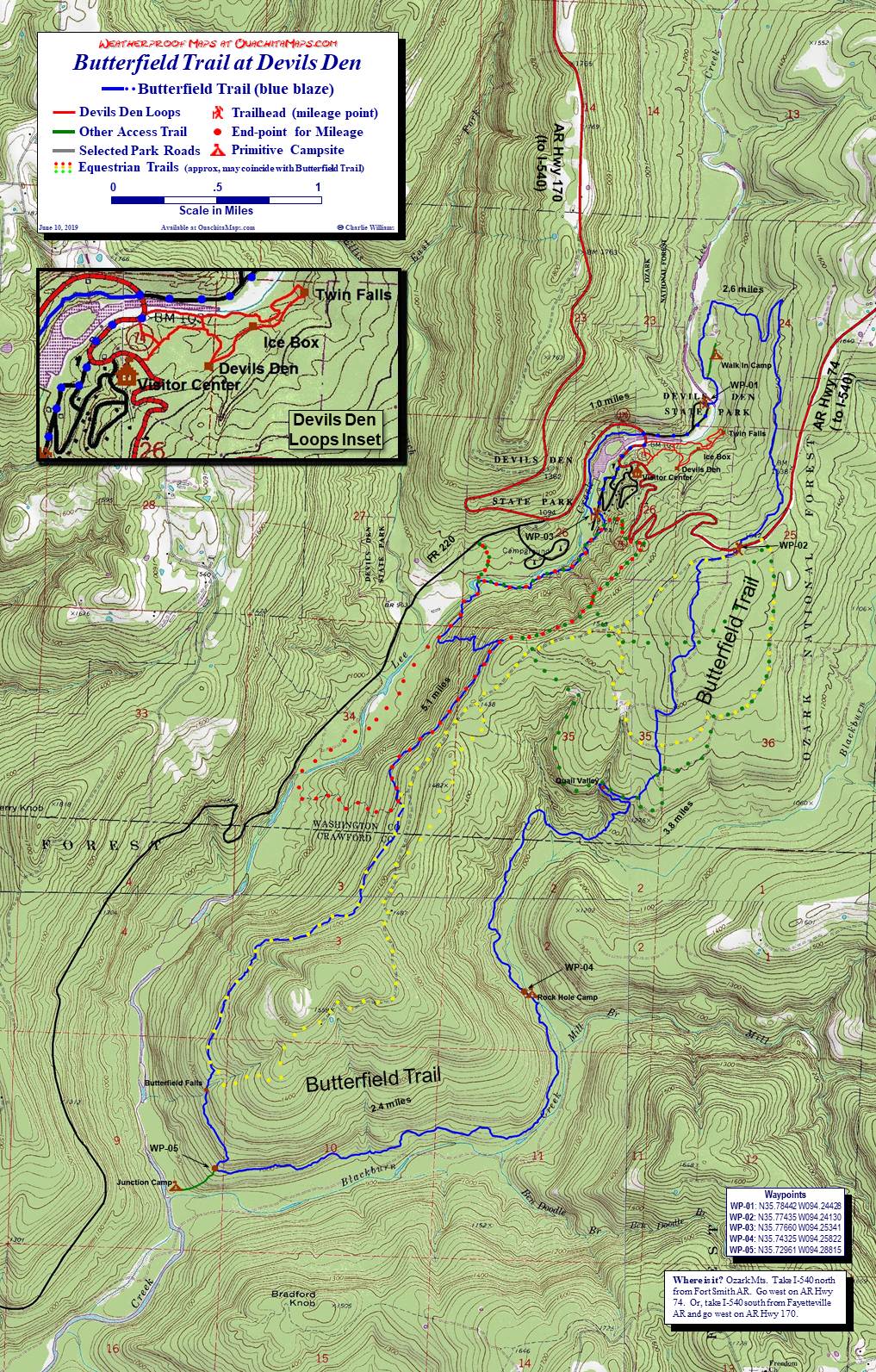 The Map: A free full size version of the map is available on this page as a downloadable jpg. It is also available printed in color on 11x17, "Rite in the Rain” all weather writing paper for $5 plus S&H by emailing Charlie at cew5151@gmail.com. It is nominal 1:24,000 based on USGS 7.5 minute quadrangle topographic maps. The Butterfield Trail was mapped with a WAAS enabled GPS and is drawn in blue to match the blazes on the actual trail. Also shown is the Devils Den Loop (red), the three equestrian trails that cross the Butterfield and selected roads. Other features include trailheads, segment mileage, general directions to park, waypoints and waypoint coordinates.