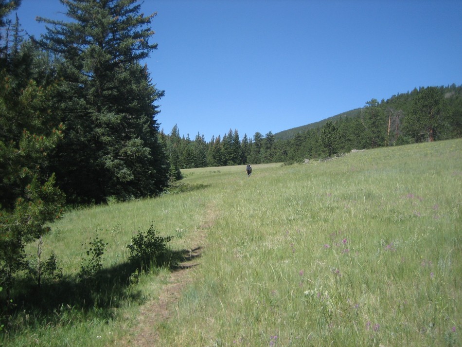 Back up to the main trail, descend 1800 vertical feet from the saddle to Little Beaver Creek and top off your water at the bridge (video) (12.6 miles). Head east after the bridge, enter Beaver Park and leave the Flowers Trail (which heads up hill to the north east) for the Little Beaver Creek Trail (855). The next 4 miles are fairly level passing though small meadows, open forests of ponderosa pines, dense stands of lodgepoles and aspen groves and past rocky bluffs, beaver ponds and occasional columbines and wild roses.
