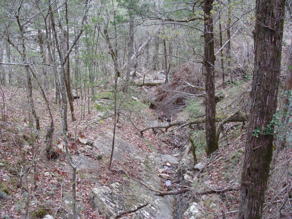 Not too far from where the trail comes out on Road 52600, there is a bridge that crosses the outcrop of a near vertical bedding plane. In wet weather it should create a nice pore off into a beautiful pool of water.