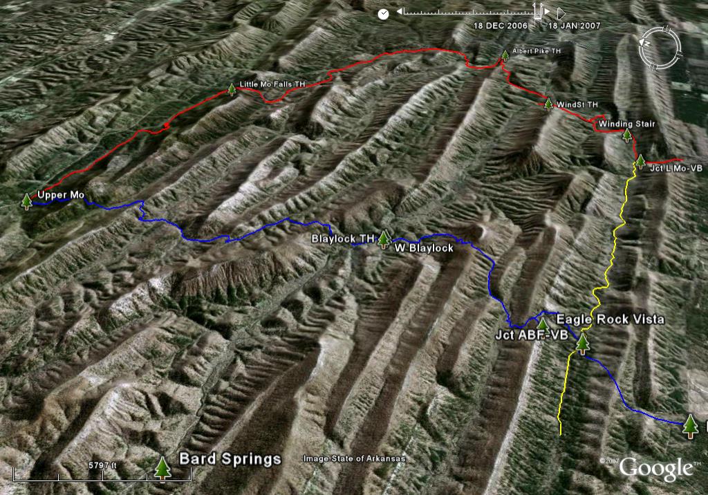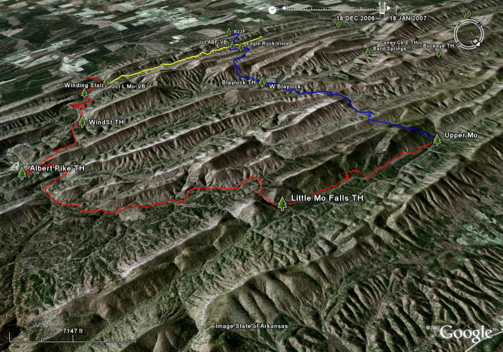 The loop is comprised of the Little Missouri, Athens-Bigfork and Viles Branch trails. The Little Missouri trail runs fairly level as it follows the Little Missouri River for about 13 miles. The Lil Mo has 8 crossings, including two bridges. The two south crossings are always wet (video), sometime un-crossable (see below). The middle two between AP and Lil Mo Falls are likely to be wet. The bridges are dry (go figure) The two upstream crossings are usually dry. In addition, there are three creek crossings that could be significant if there has been rain; Blaylock (video), Brier and Longs. The Athens-Bigfork Trail is over 9 miles, cuts across 6 ridges (Hurricane Knob, McKinley Mt, Brier Creek Mt, Leader Mt, Brush Heap Mt and Fodderstack Mt) and has several potentially wet crossings (notably Longs Ck). The Viles Branch Trail is a level trail that follows Viles Branch for 3.5 miles. There are 11 crossings that are usually dry (i.e. dry boots).