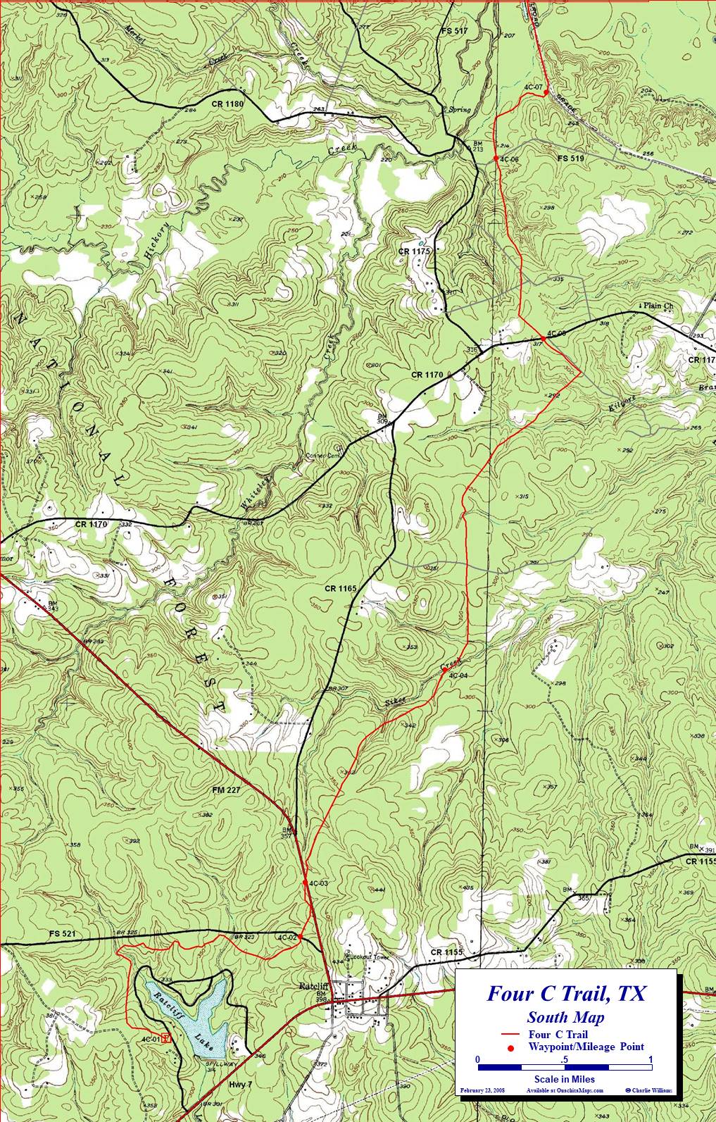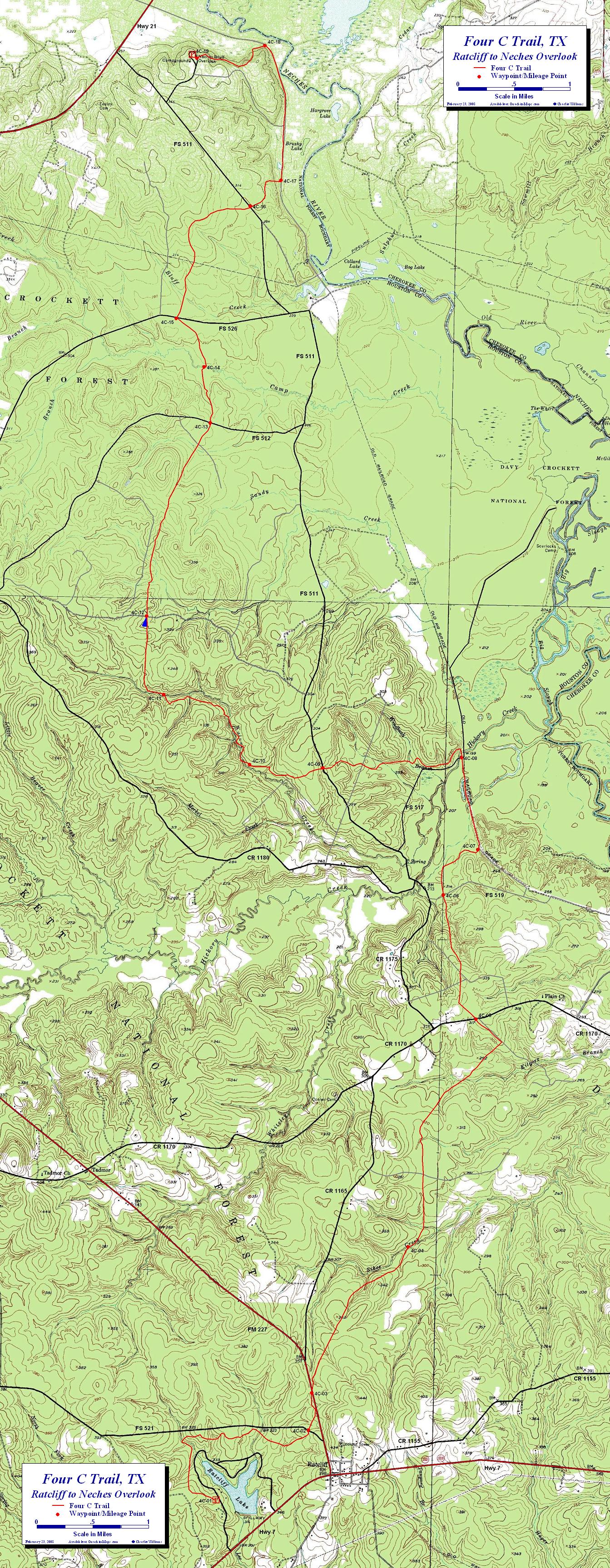Info: The Four C Trail was featured in Waypoints, Backpacker Magazine, December 2006, Midwest Edition. USGS 7.5 minute quadrangle topographic maps are Ratcliff, Kennard NE, and Weches, TX. Contact the Davy Crockett National Forest in Kennard, Texas at (936) 655-2299.