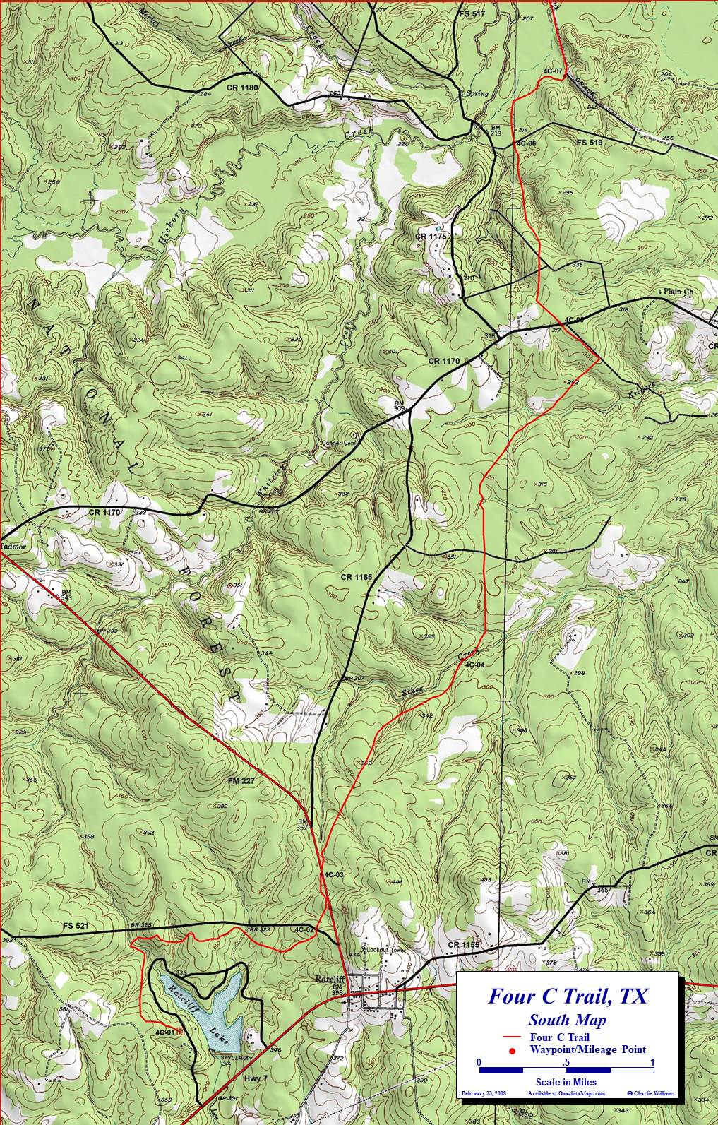 Info: The Four C Trail was featured in Waypoints, Backpacker Magazine, December 2006, Midwest Edition. USGS 7.5 minute quadrangle topographic maps are Ratcliff, Kennard NE, and Weches, TX. Contact the Davy Crockett National Forest in Kennard, Texas at (936) 655-2299.