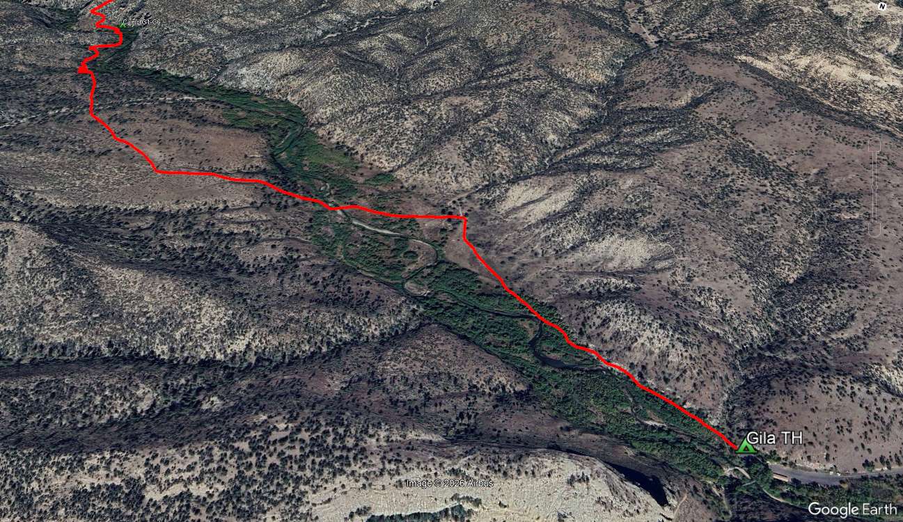 The trail begins at the end of the road, next to the beginning of the loop trail tyo the dwelings. Instead of going south, head west on the West Fork of the Gila River Trail #151. We had a long drive, took the tour and got a late start. As a result, our first camp was only 2.1 miles from the trail head. But what a great site overlooking the West Forkpof the Gila. On the way we saw a wilderness cliff dwelling and some cool spires.