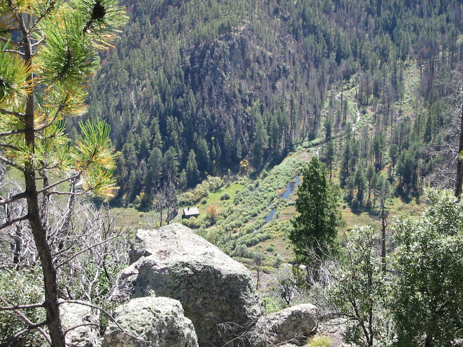The hike starts at the Willow Creek Trailhead in the Willow Creek Campground. The campground is 17 miles (but over an hour) west of Mogollon NM on Highway 159 (Bursum Rd). See this image. The hike starts with a crossing of Willow Creek and Turkey Creek. After that you are out of the campground and starting a 350 foot climb up McKenzie Trail (#151) to Iron Creek Lake. Turn east at the junction of the Iron Creek Mesa Trail (#171, 1.3 miles) and head across Iron Creek Mesa. The mesa is underlain by mid-Tertiary Datil-Mogollon volcanics ranging from rhyolites to andesites. At 6.8 miles begin your 600 foot decent down to the meadow next to the Middle Fork of the Gila River (7.4 miles).