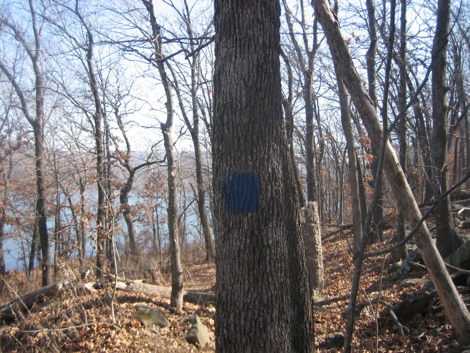 The trail leaves the trailhead and heads south through the hardwood forest. You are still in the main part of the park so you will see the park road to you left. In just a few hundred feet you will pass the back side of the 17 mile marker. At mile 0.3 you will pass under a little hut like structure and see a cabin on the lake at the end of the park road. In another few hundred feet you will be even with the earthen dam and the trail will start to follow a forest road. Not for long, however. Watch for the blue blazes leaving down hill to the left. After following the lake shore for 0.2 mile, the trail crosses the forest road and goes back into the wood. It will cross the road again in less than 0.1 miles. After crossing under a power line the trail will pass through the woods and come out on Highway 10. Turn left and walk across the Highway 10 bridge. On the other side the trail leaves the highway and heads east on a broad trail to the Alternate Trailhead.