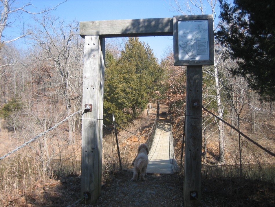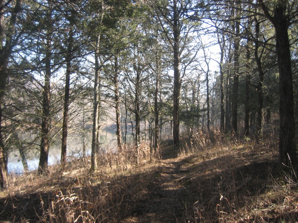 This next section follows an arm of the lake heading for the swinging bridge. It passes mile marker 1 about 1.8 miles from the zero mile marker at the main trailhead and then a small bluff with an overhang the might be a good shelter for a surprise thunderstorm. You will pass a cedar groves and get some nice views of the lake.