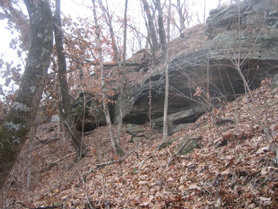 Past mile markers 5 (GPS mile 5.6) and 6 (GPS mile 6.6) the trail follows the low side of a bluff. The area features small outcrops, moss covered rocks and hardwoods. Above it over this section is the upper trail. It is close but hidden from the lower trail and accessible only through a short but difficult bushwhack.