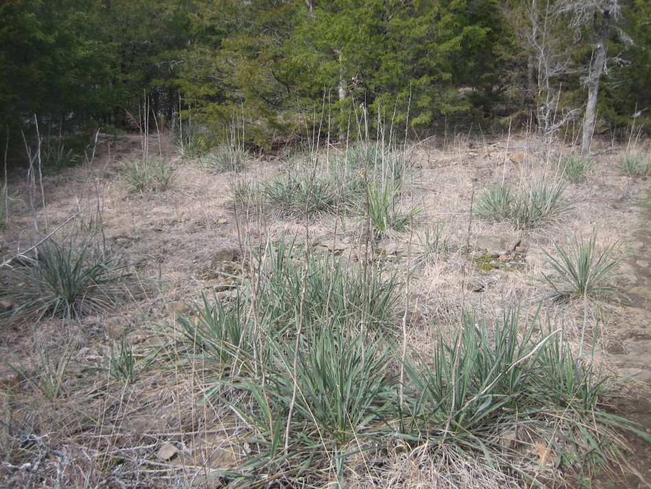 Over the next mile, you will be crossing a micro xeric sandstone prairie ecosystem. The first thing to notice is are the abundant red cedars and then you will see the prairie grasses and yucca. Next you might observe outcrops of sandstone on the forest floor. You might also notice the gentle topographic slope towards the lake is controlled by the dip slope of the sandstone. What is happening is there is very competent bedding plane of the Bloyd-Hale Formation that is holding up the forest floor. It is resistant to erosion so the soil horizon is thin to non existent. The thin soil horizon means there is little capacity to hold ground water and no ground water pushes the ecosystem from the typical Ozark hardwood forest to a dry land prairie that is favored by red cedar and grasses.