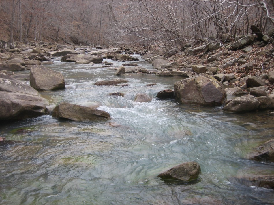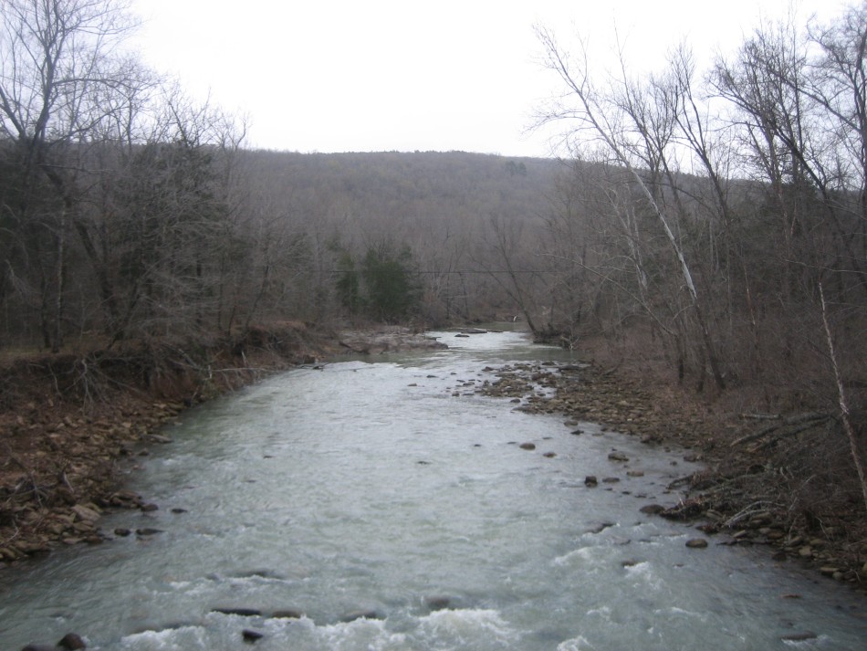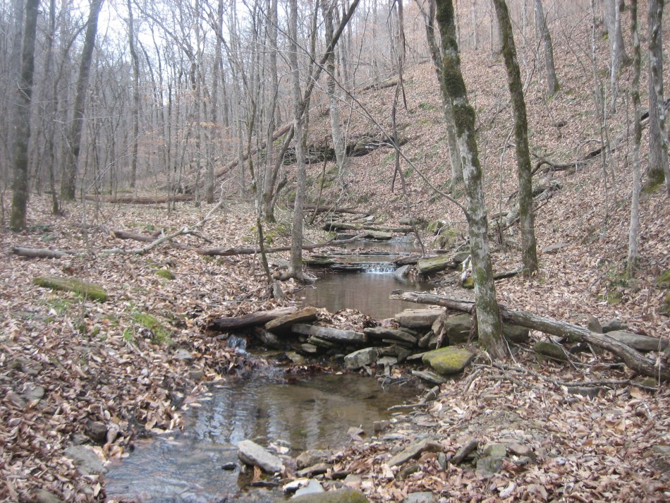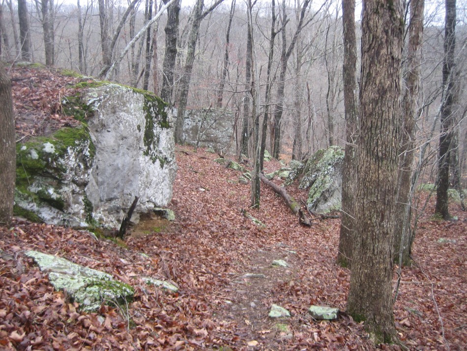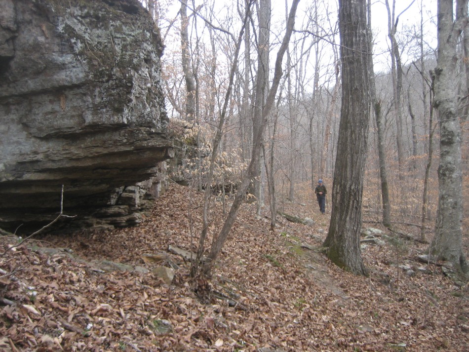 At OHT-18 turn left and cross the Little Mulberry River (video) on a concrete road bridge. No wet feet here no matter how much rain (unless that Noah guy shows up). Stay on the road for 0.3 miles and just past the pasture on the right, turn right and follow the easement. Climbing out of the bar ditch you will see a stand of river cane. Follow the narrow easement for a little over 0.1 miles until the trail enters open forest. The forest up to mile marker 57 is hardwood on a fairly gentle but rocky hillside. Past mile 57, it becomes very rocky with bluffs to your right and boulders the size of a truck. I found this area very scenic. The last part of this section is a boulder hop across Lick Branch. Cross county road 5051 (OHT-17, OHT mile 56.3, trip mile 29.3) and the Lick Branch trailhead is on the right.