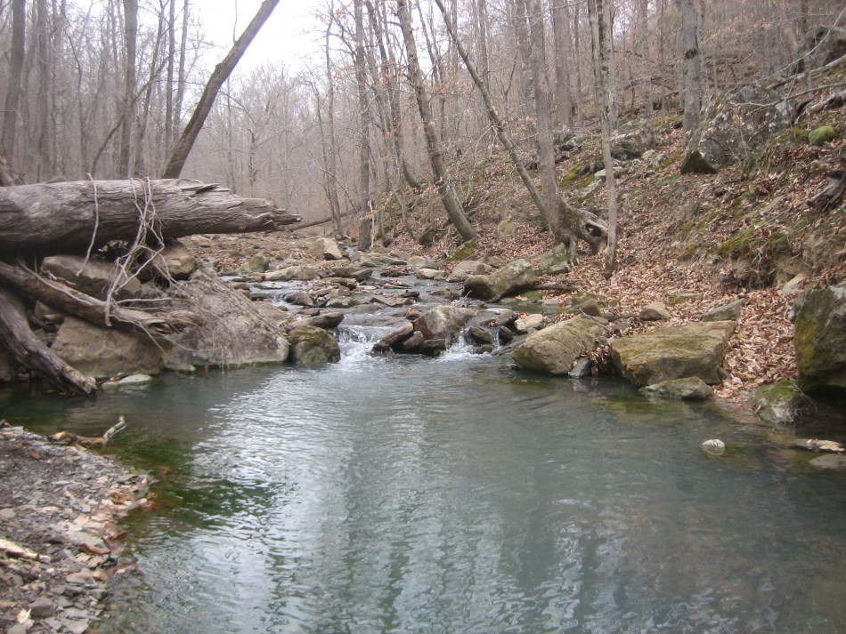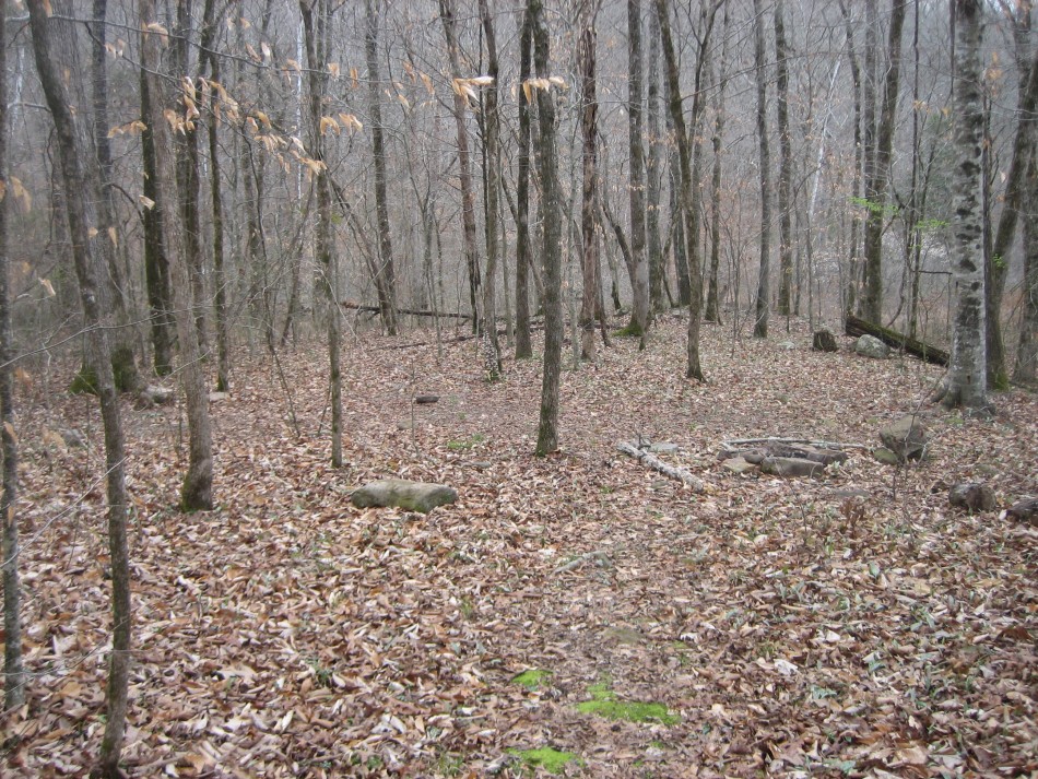 It is just shy of a mile to Indian Creek on the OHT, all down hill. When the trail reaches the valley floor you will see a large flat expanse of fairly open forest with lots of cedar and one really tall sweetgum. The main campsite is a little further down the trail near the creek and has an Arkansas fire pit and stone furniture. We opted for an LNT camp in a large open area next to a stand of river cane south of the trail on the east edge of the valley floor. However, with such a large flat area, you can find many other places to set up camp if need be.