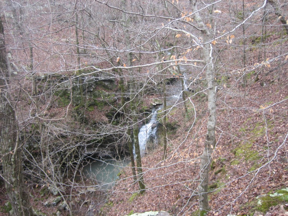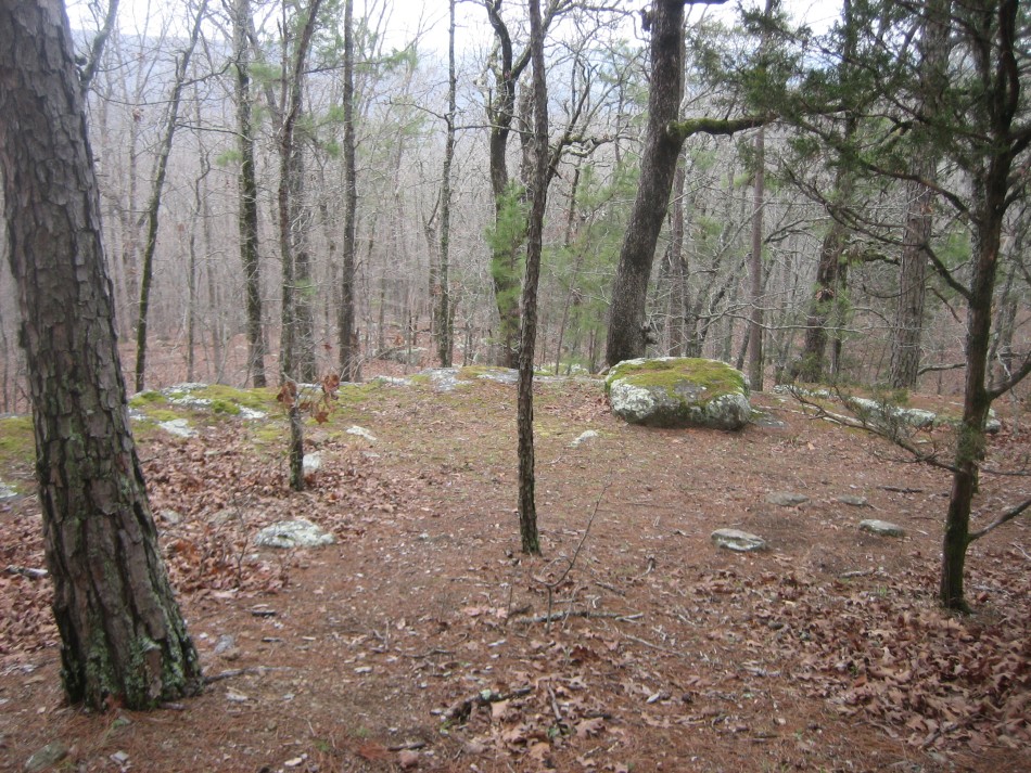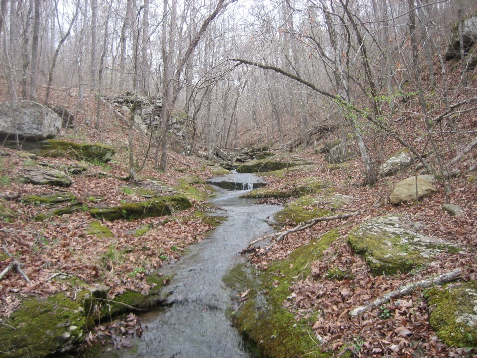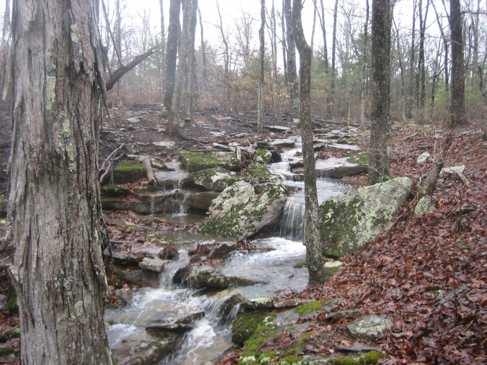 In 0.6 miles there is a campsite on the right. It is worth stopping and checking out the bluff (video). The Atoka sandstone is fairly massive here and forms some 30 foot cliffs around a small drainage. The top is mossy and there is a small chasm where a huge section has broken away from the bedrock. There is a stream about 400 feet further down the trail that should be reliable most of the year. Across the creek, the OHT heads west along the top of a ravine and passes mile marker 60. The next 2 miles is a 600 foot descent on switch backs. My favorite part was the massive moss covered outcrop at the bottom of the mountain.