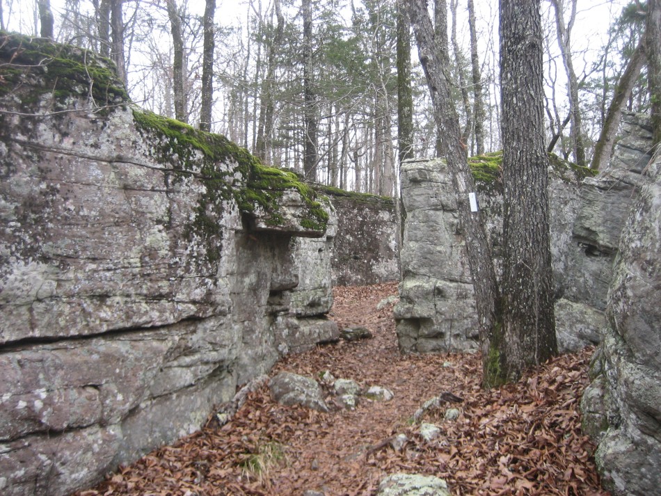 The OHT climbs 200 feet to mile marker 56 and then follows the side of a hill heading south. After about a half mile it turns north and goes up the nose of the hill. At the top is a low bluff of dense sandstone. Some rather large parts have broken free of the bedrock and have slumped away forming a little rock maze. The trail climbs to the top of the bluff and heads westerly. For the next 0.3 mile the trail stays on top of this persistent sandstone layer until mile marker 55. Then the trail climbs a little and contours to FR 1541 (OHT-16, OHT mile 54.4, trip mile 31.2).