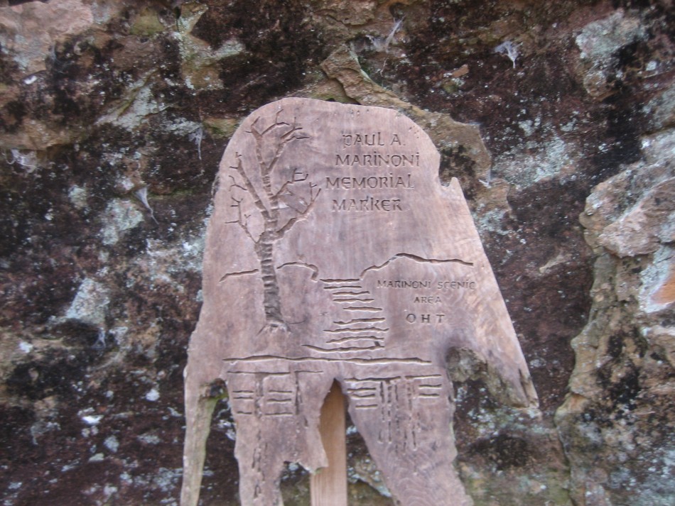 Some of the most scenic parts of the trip come in the next mile. This is Briar Branch and the Marinoni Scenic Area. As you descend into the hollow you'll pass huge boulders, a chimney shaped pinnacle, a small creek pool and then the Marinoni sign. But wait, there's more. The valley narrows and the sandstone bluffs get bigger. Above is 35 feet of cliff face (video) and below is a steep v-shaped valley filled with truck sized boulders and beech trees. When the valley begins to open up, the trail crosses the creek and there is a stone bench in an idyllic spot waiting for you to shed your pack and rest your feet. As the trail climbs out of the creek bed, there is a camp site below to the left. As Lloyd the shuttle driver says, this is a PPP, a pretty, pretty place!
