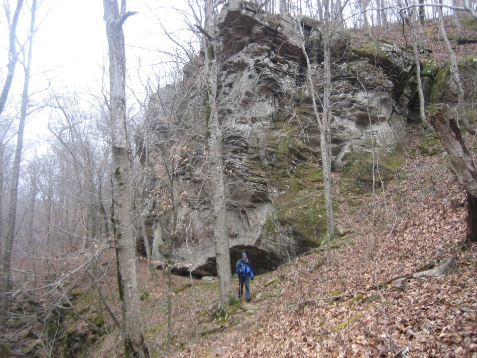After leaving the head of the hollow, the trail begins to descend and soon crosses a forest road. The descent continues until the trail gets on a rocky bench passing several sandstone outcrops and some overhangs that could provide temporary shelter. The trail in this section is rocky. Although the tread was usually evident, the boulder strewn path slowed us down a bit. At about OHT mile 76.2 the forest opens up and the trail gets close enough to the creek (video) to warrant a break and time to ponder the beautiful woods around us.