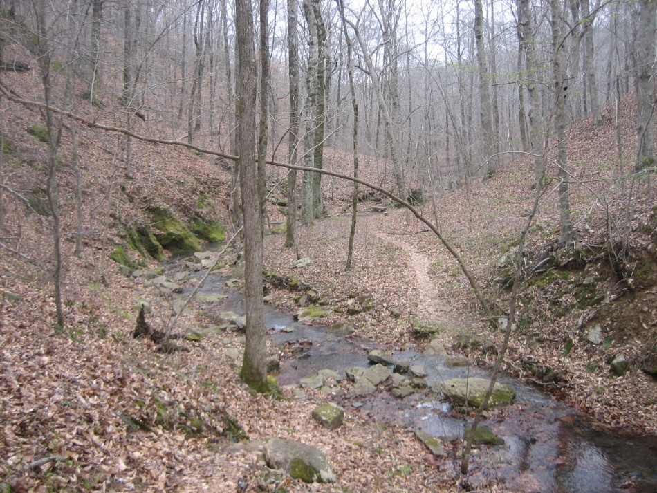 Lick Branch to Morgan Mountain (OHT Map 5): The Lick Branch trailhead is accessed by going north from Highway 215 on Co 5099 for about 2 miles and then left on 5051. The parking lot has room for half a dozen cars. There is a big fire ring at the west end of the parking lot and a smaller campsite between the parking lot and the creek to the south. There are some social trails around the parking lot so follow the white blazes to get to the other side of the small creek.