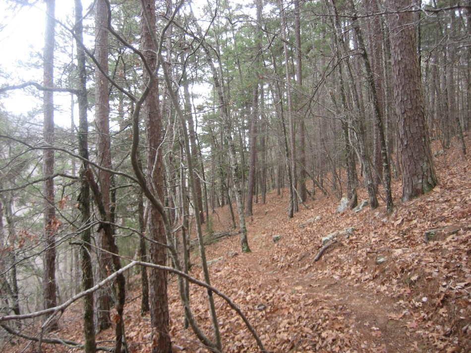 The OHT stays on a level bench in the vicinity of mile marker 67, works its way around another pour-off just below Hignite Gap and begins a 350 foot climb. After passing mile marker 66, there is a switch back and finally Forest Road 1474/1453 (OHT-20, OHT mile 65.7, trip mile 19.9).