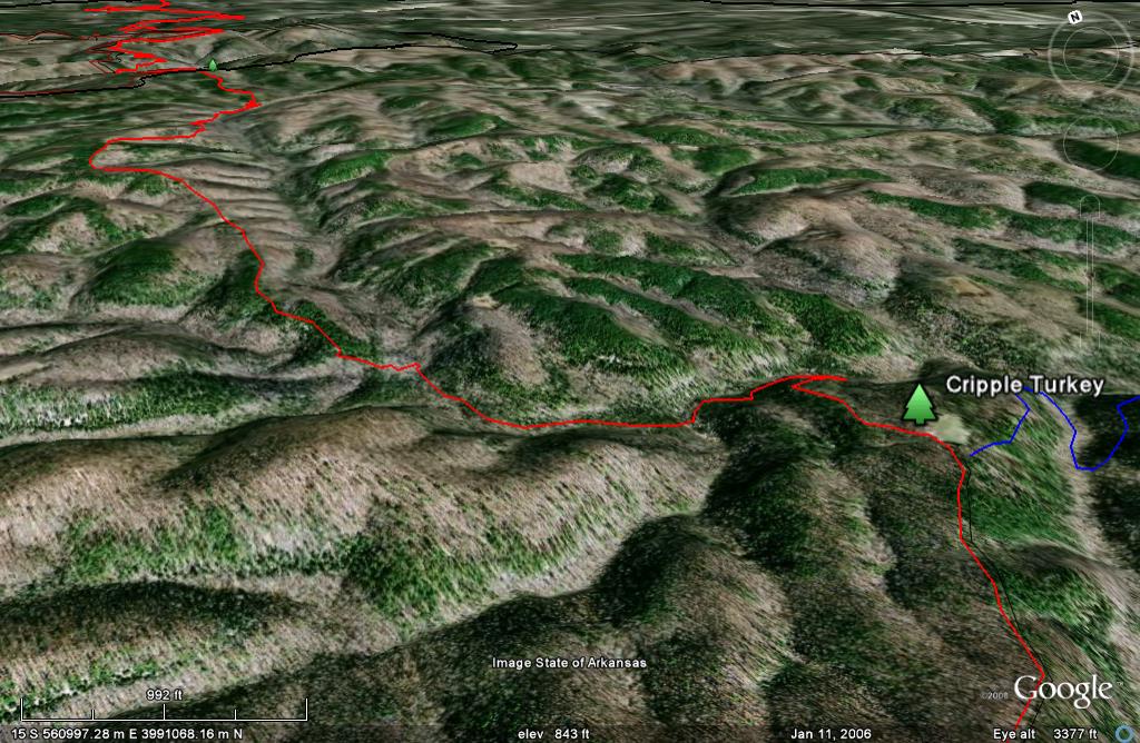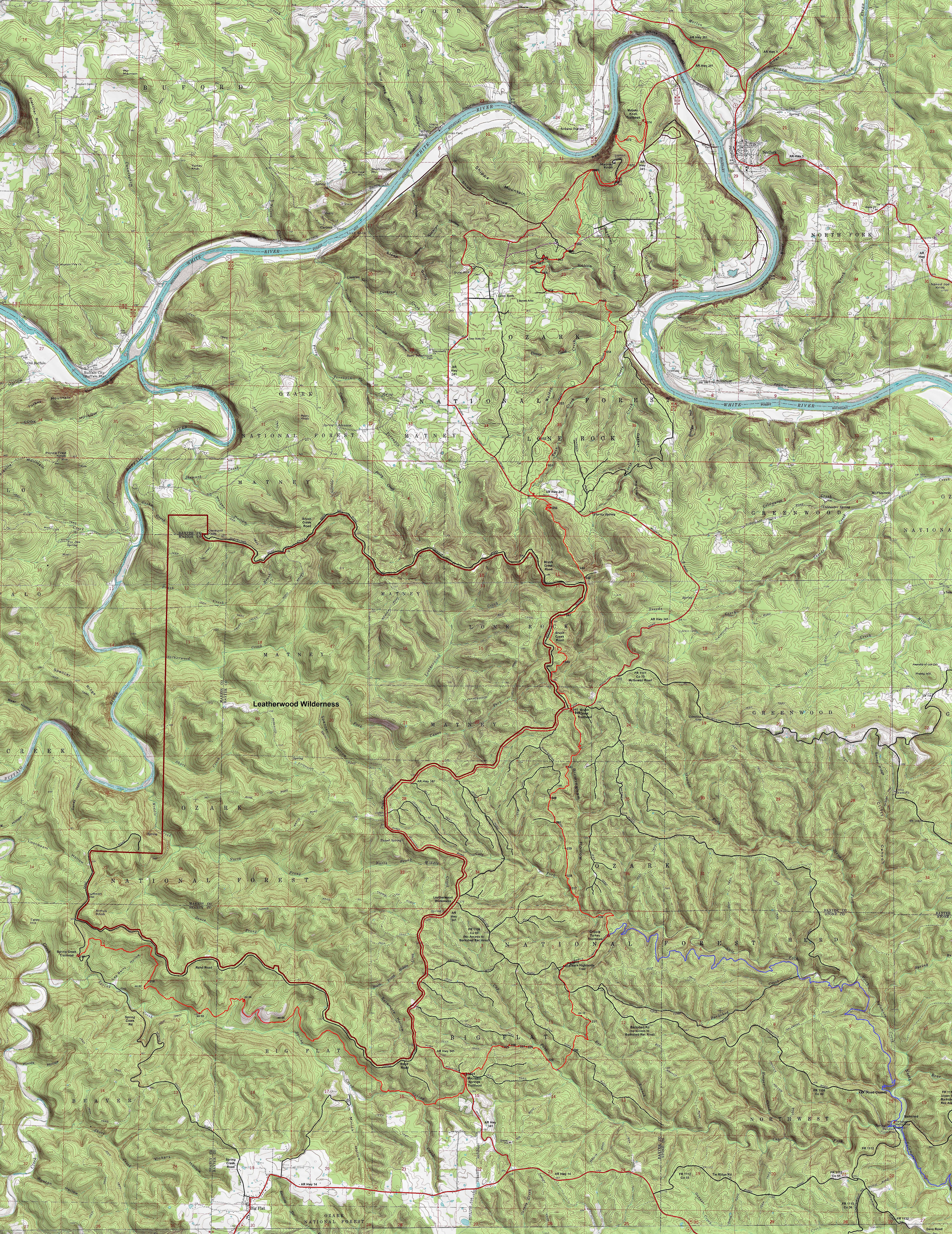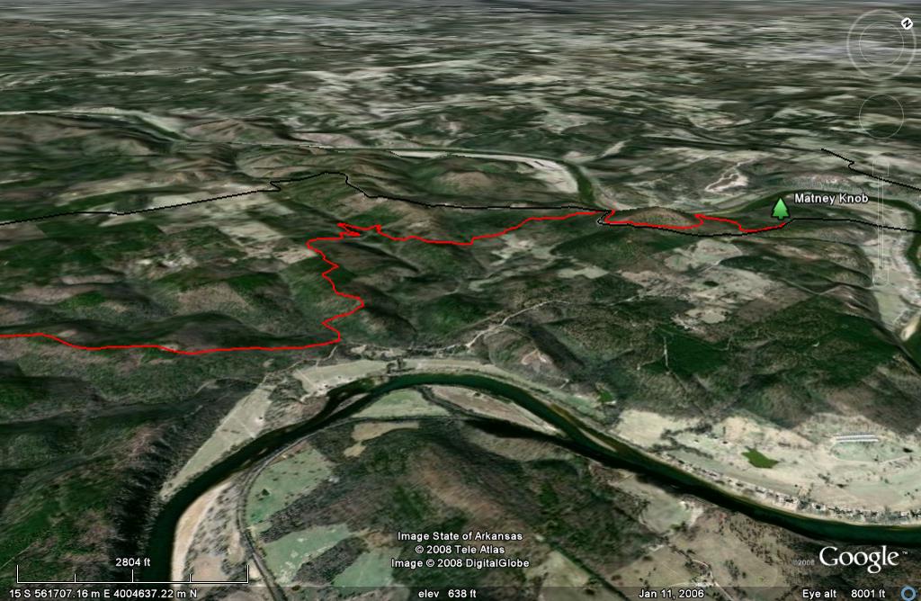 The OHT Sylamore Section is situated in the Ozark Mountains of Arkansas near the confluence of the Bufflo and White Rivers. The OHT trail is based on my GPS track of the trail. The roads are based on satellite images.