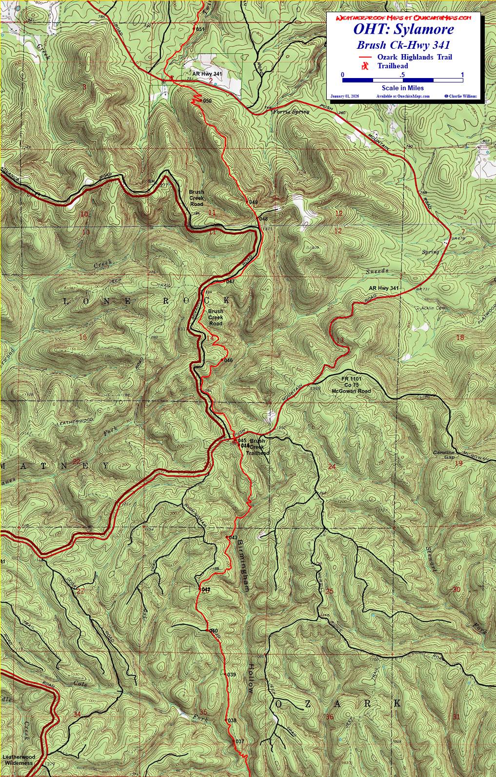 The next map is the Brush Ck-Hwy 341 map. The trail leaves Birmingham Hollow and tracks north on the west-adjacent ridge to the Brush Creek Trailhead. It crosses AR Hghway 341 and follows the Brush Creek Road and eastern boundary of the Leatherwood Wilderness for a couple miles. When the road and wilderness boundary curve to the west, the OHT continues north. It stays on a ridge for a couple mile then drops down on switchbacks to cross AR Highway 341, again. The trail heads NNE for another mile and leaves the map.