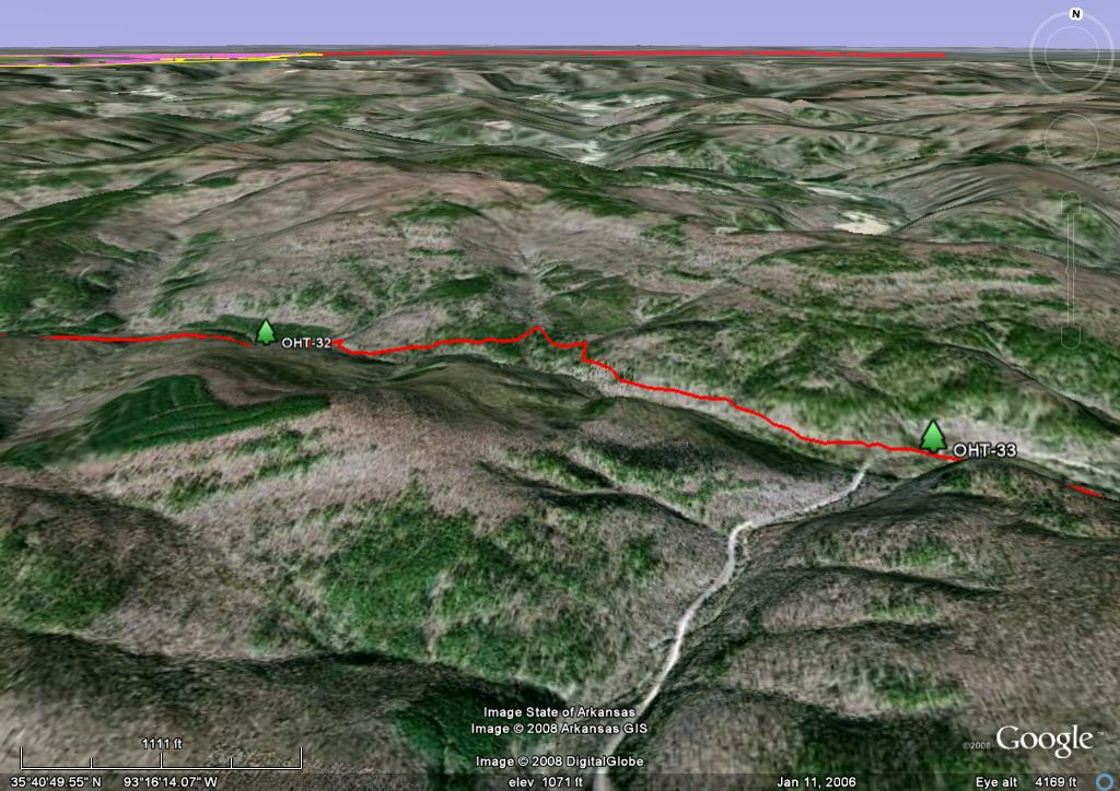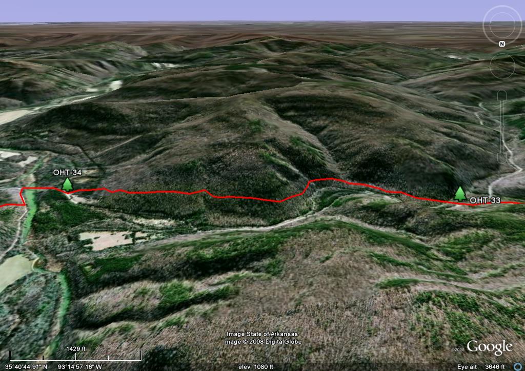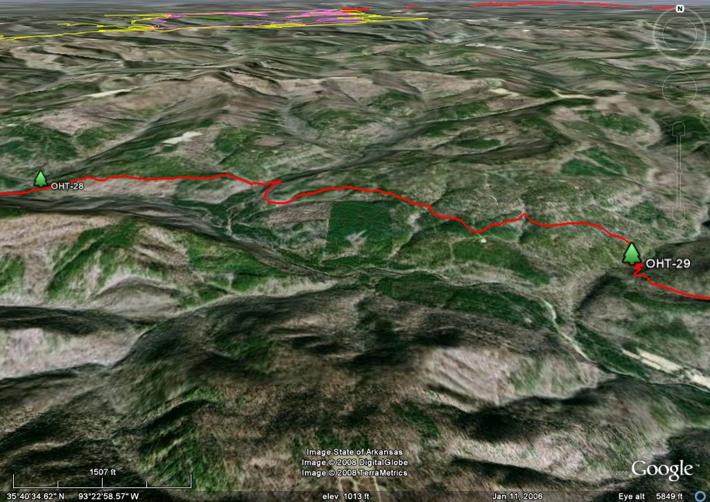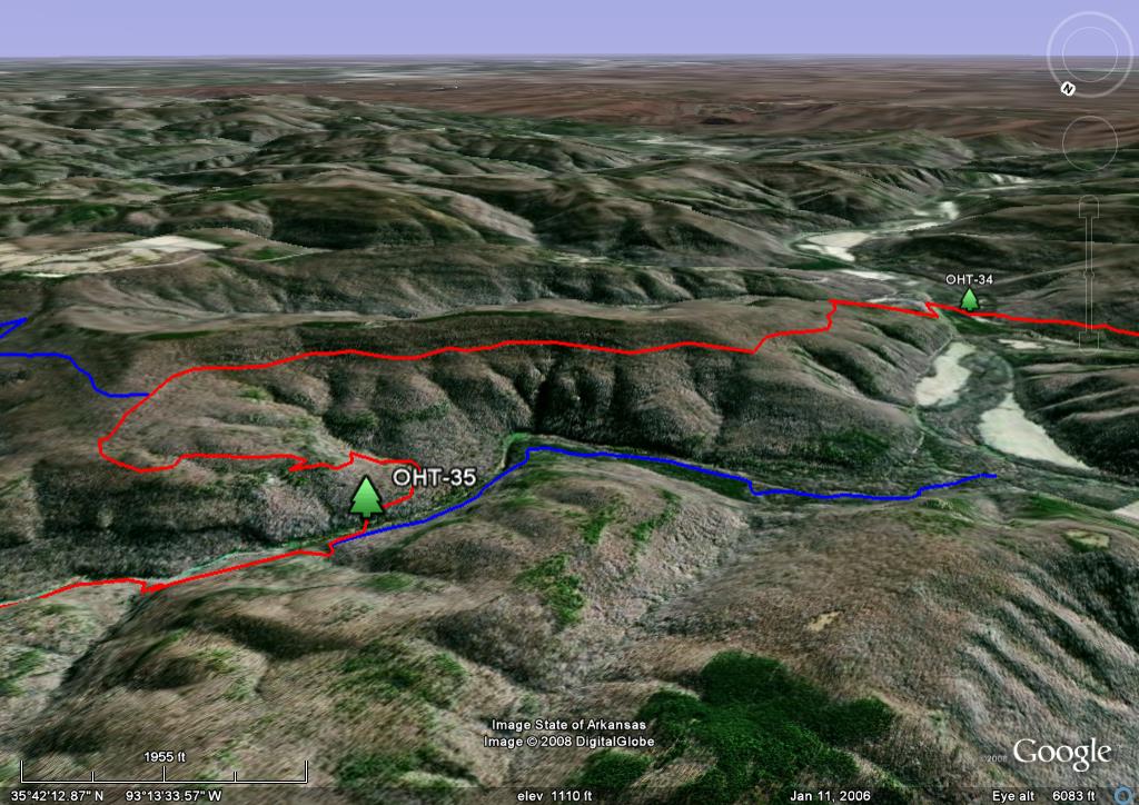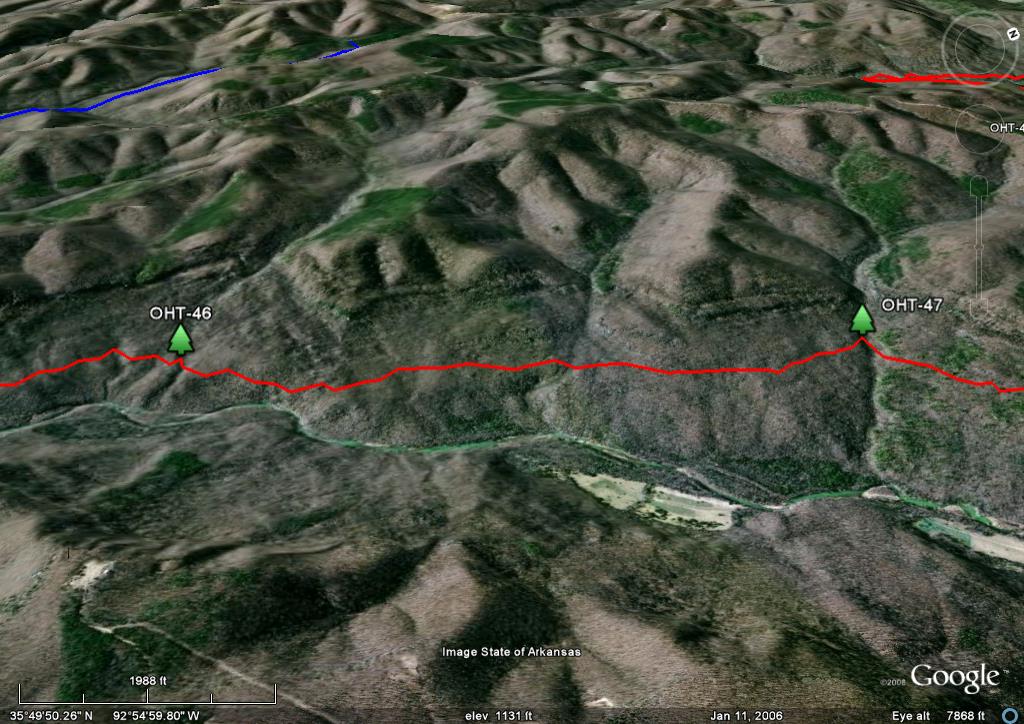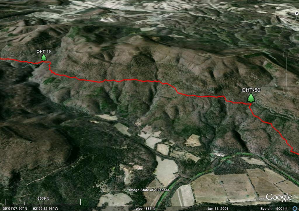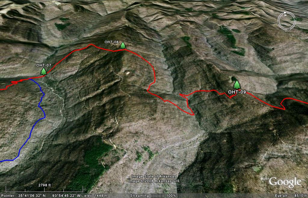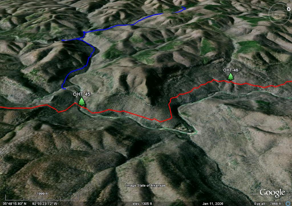 The maps have been updated since I first posted them in January 2008. I have re-GPSed the trail from Lake Fort Smith to Woolum and added the trail description pages. I was foiled by highwater so the 1.4 mile section between Ben Hur and the Richland Creek crossing is based Eric Strong’s 2004 GPS track and Google Earth. Because of the scale of these maps and GPS data, they are the most accurate maps available for the trail. I hope you find these useful for your next trip to the Ozarks.