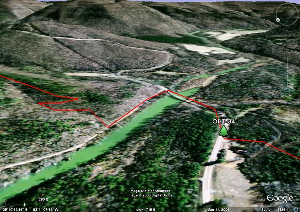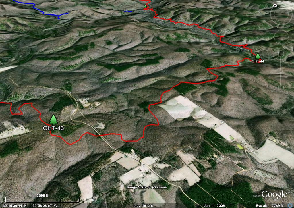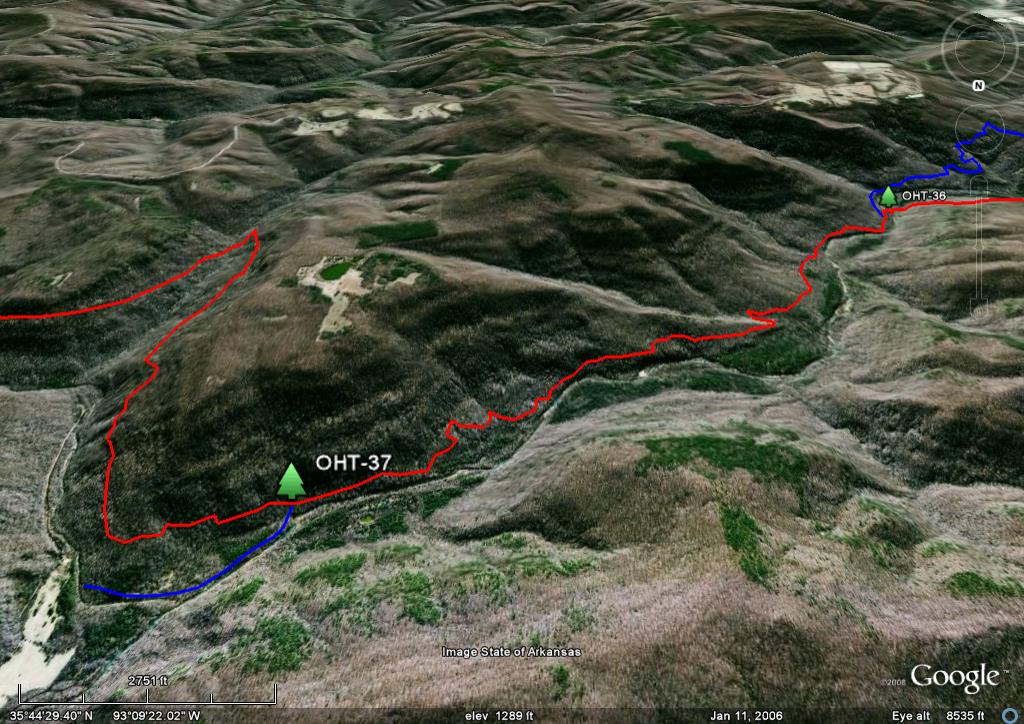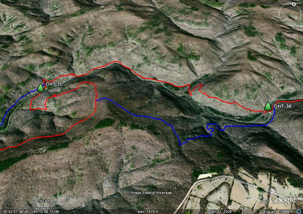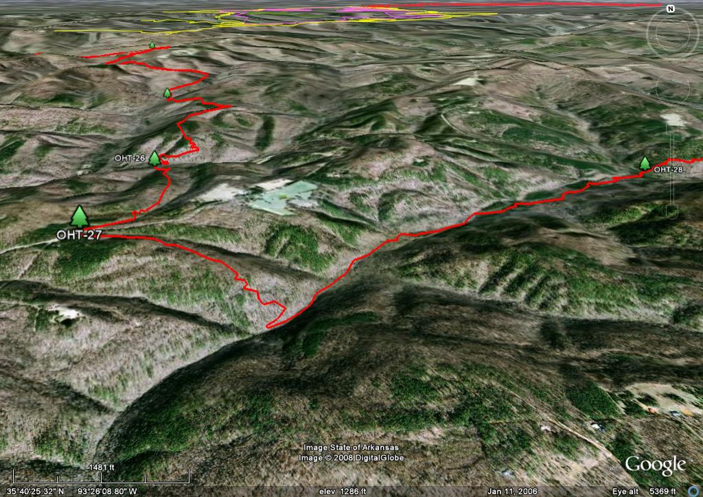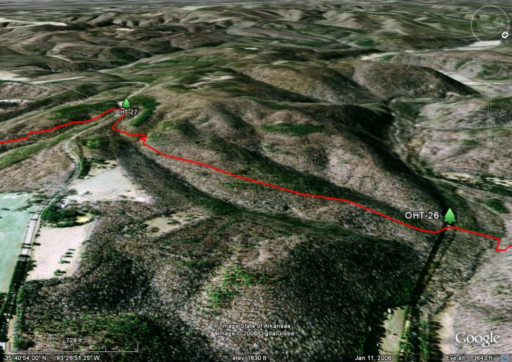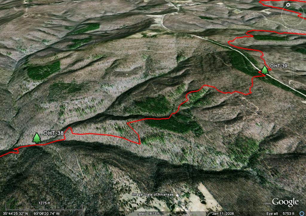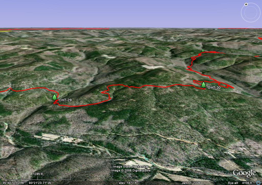 The maps have been updated since I first posted them in January 2008. I have re-GPSed the trail from Lake Fort Smith to Woolum and added the trail description pages. I was foiled by highwater so the 1.4 mile section between Ben Hur and the Richland Creek crossing is based Eric Strong’s 2004 GPS track and Google Earth. Because of the scale of these maps and GPS data, they are the most accurate maps available for the trail. I hope you find these useful for your next trip to the Ozarks.