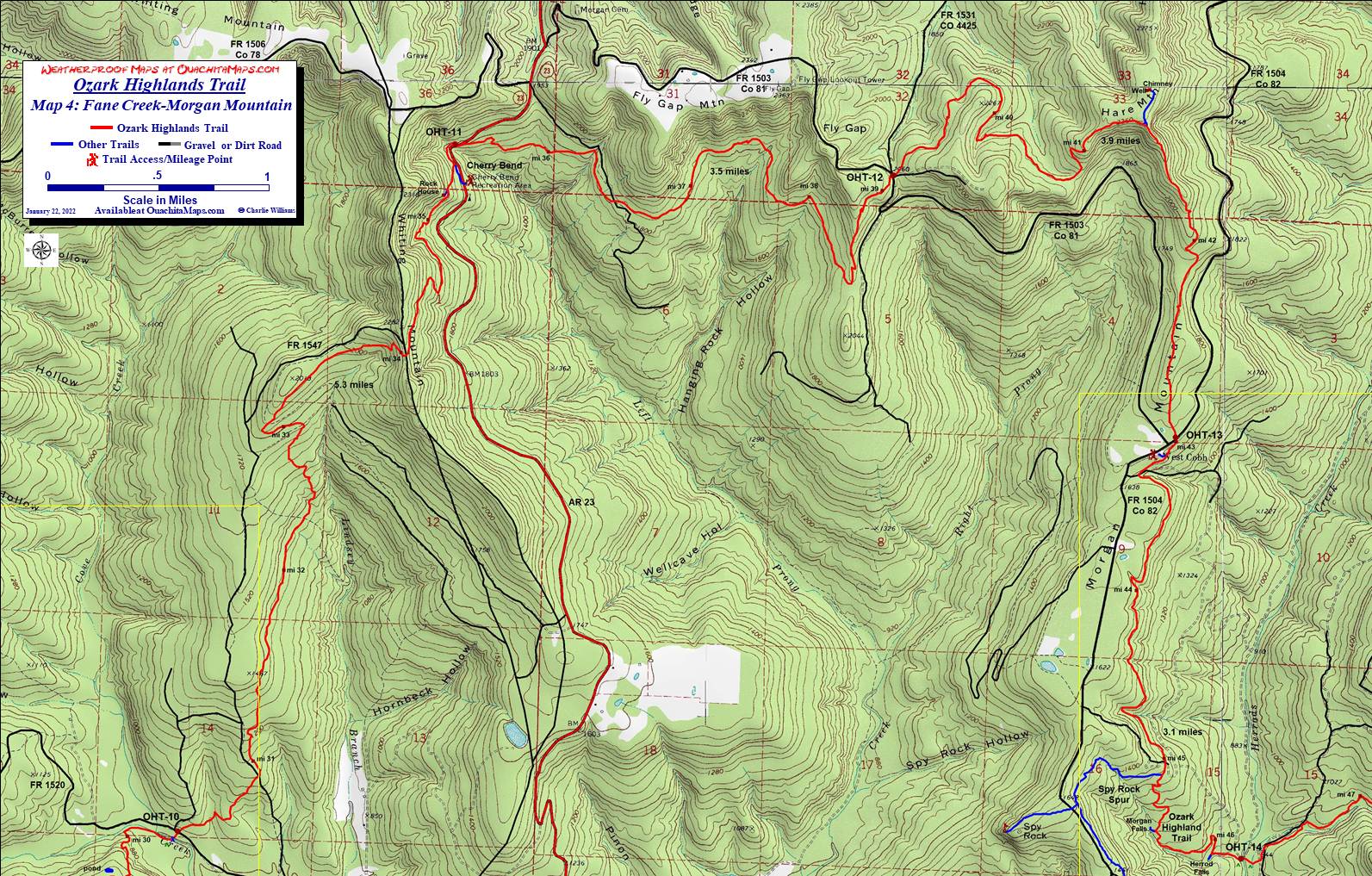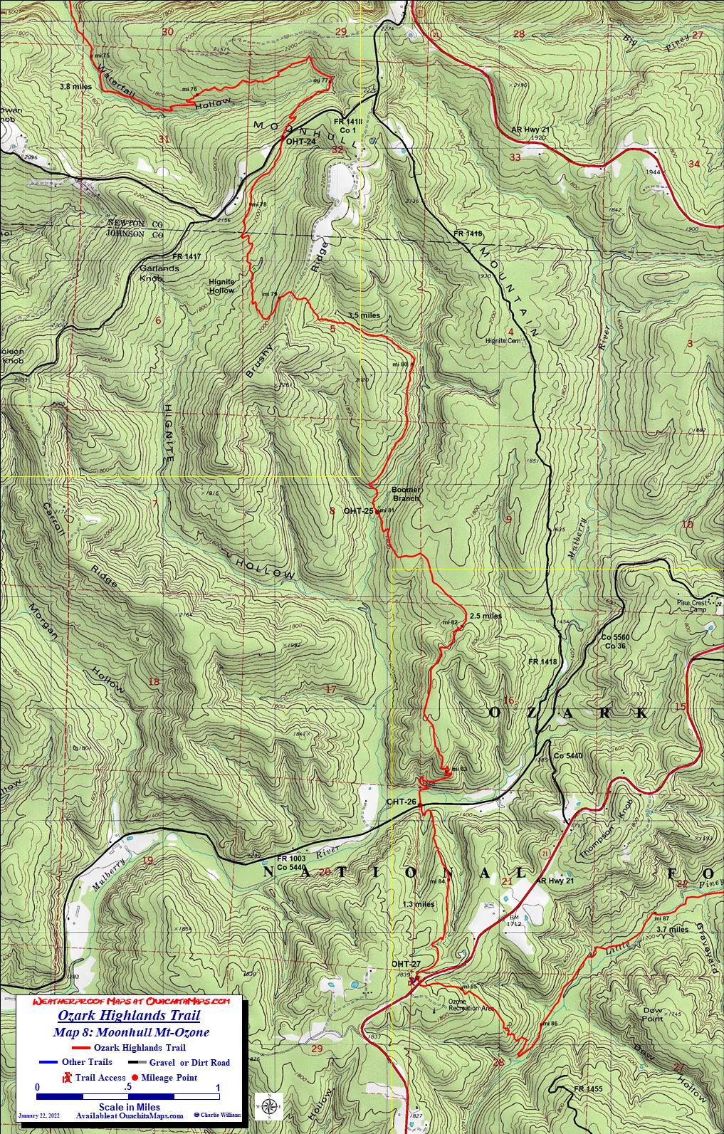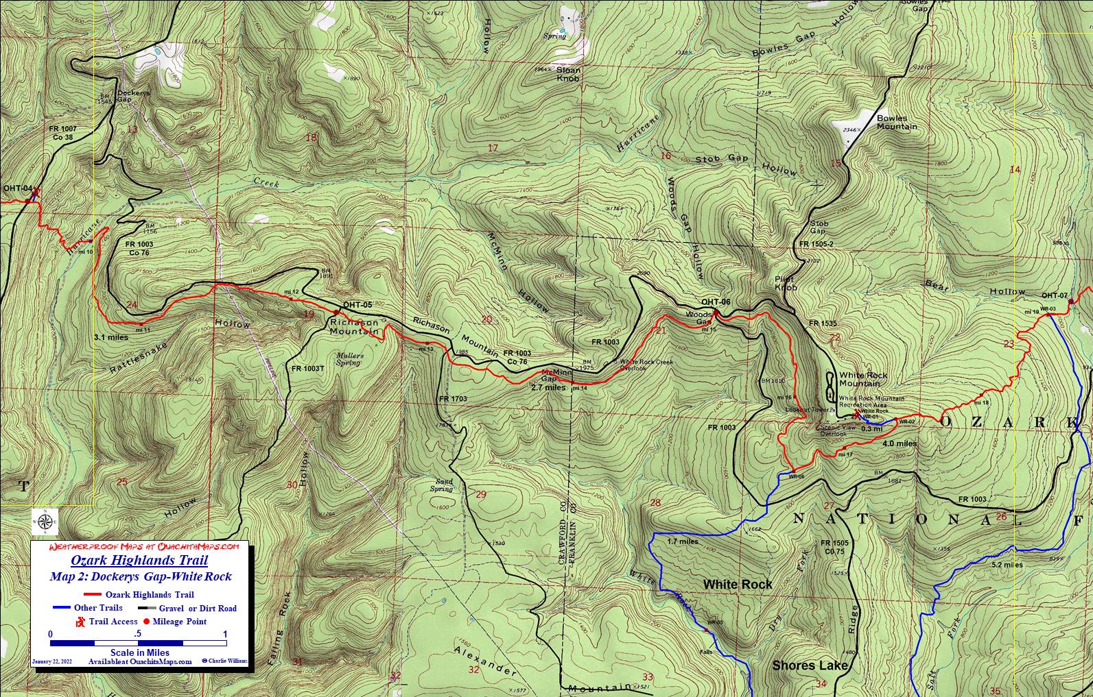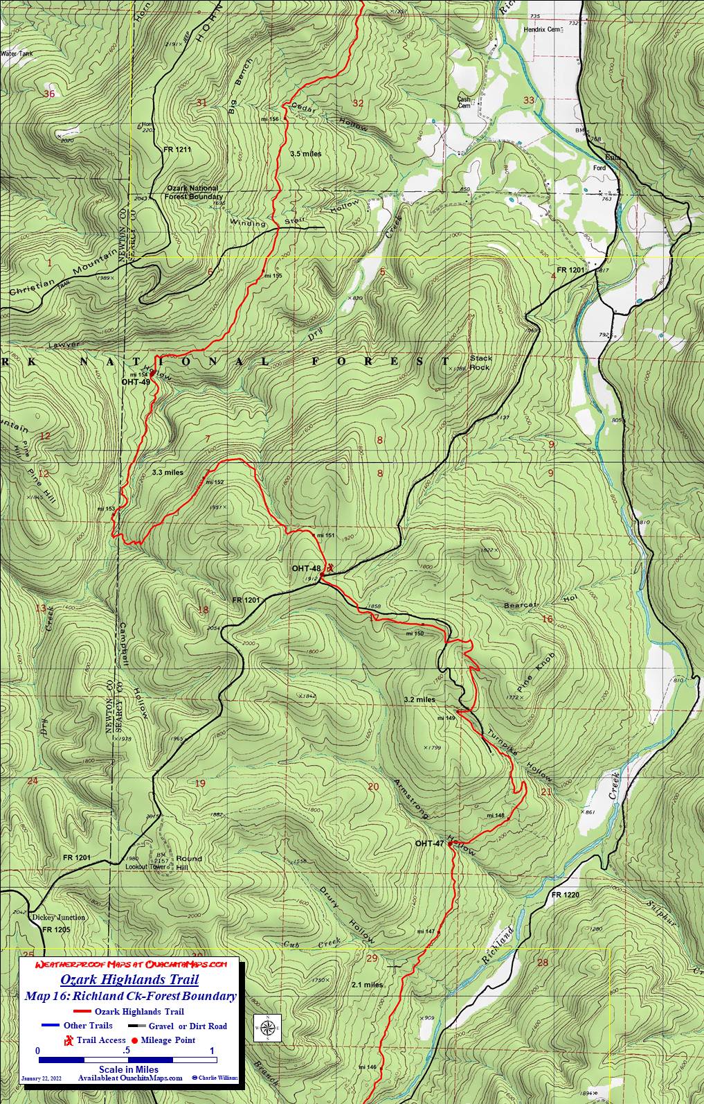 The base maps are a composite of USGS topos. The OHT is shown in red and other trails are shown in blue. Mileages between waypoints are provided and are based on the offical distances between mile markers. The forest roads have been enhanced and updated using aerial photos, satellite imagery and the 2005 Ozark National Forest map. Many different road designations are shown because they have different names on different maps: Some are forest roads, some county roads and some are local names.