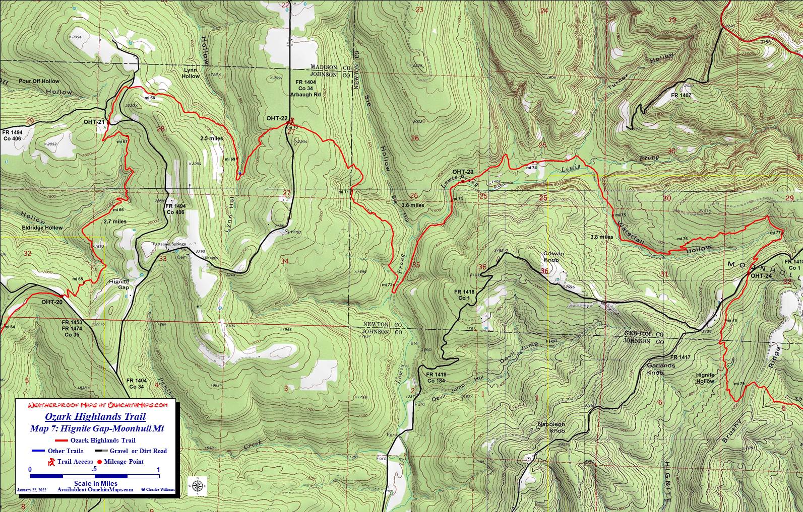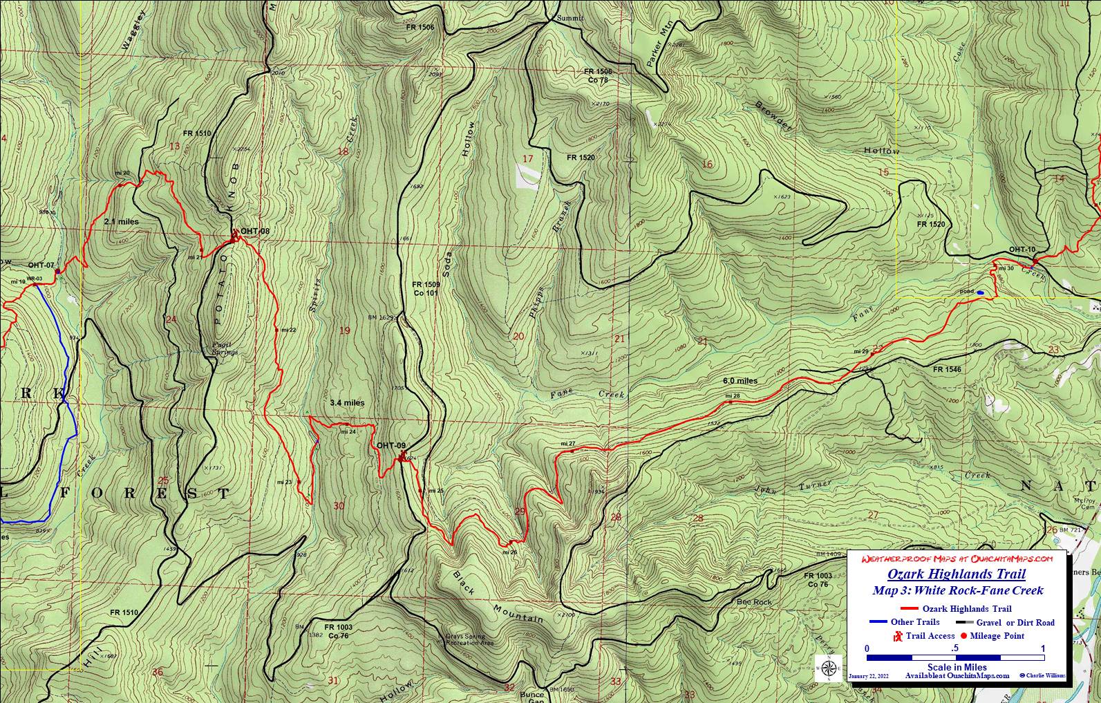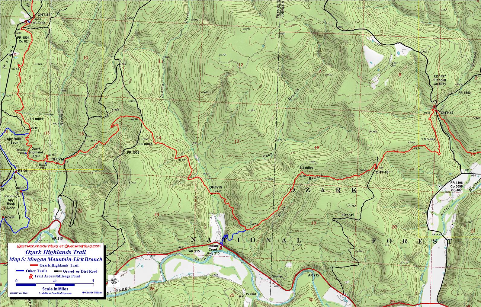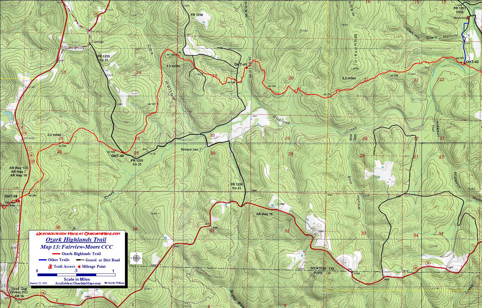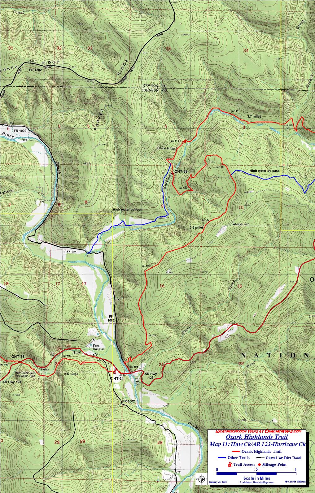 The base maps are a composite of USGS topos. The OHT is shown in red and other trails are shown in blue. Mileages between waypoints are provided and are based on the offical distances between mile markers. The forest roads have been enhanced and updated using aerial photos, satellite imagery and the 2005 Ozark National Forest map. Many different road designations are shown because they have different names on different maps: Some are forest roads, some county roads and some are local names.