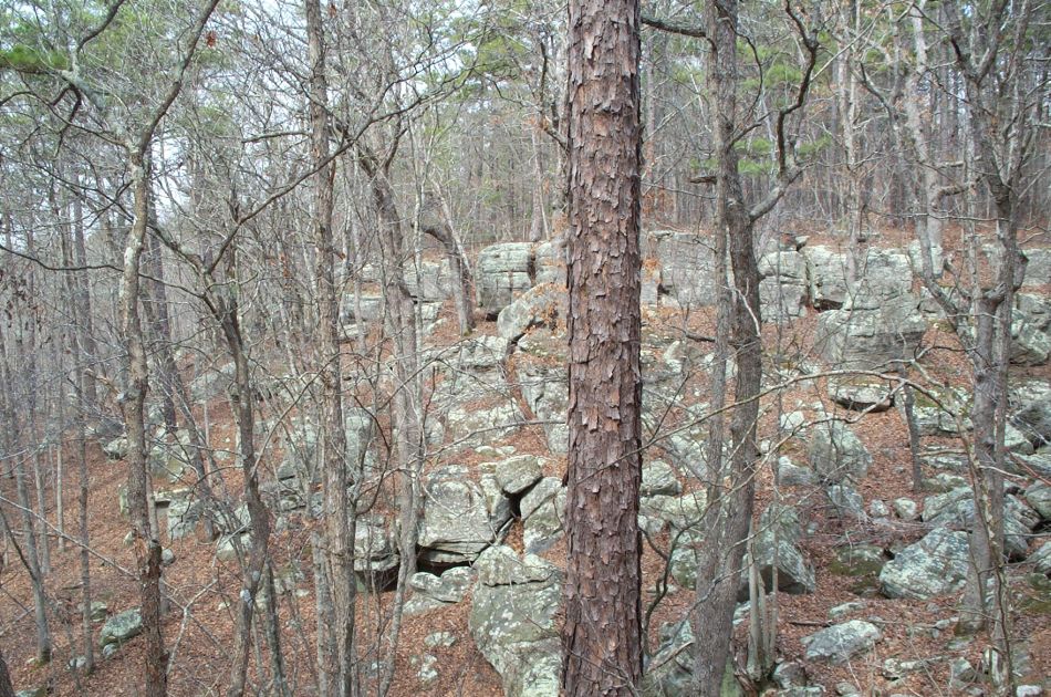 Background. The trail makes for an easy overnight backpacking trip. It is hilly, but an easy hike with relief changes of generally less than 300 feet. It is a typical Ozark forest of hardwoods and pines with leaves covering the rock strewn ground. As with any hiking in the Ozarks, the summers are very hot, the vistas hidden due to leave cover and water will only be found in the major streams. Hiking is best in the fall, winter and spring when the views are plentiful, insects gone and temperatures nice and cool for sleeping.