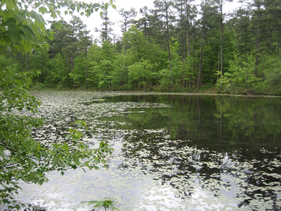 About 0.15 miles into the woods there appears to be a reroute. You will see a creek bed in front and a trail going left. Go left. You'll run into the trail that followed the creek in a few hundred feet. According to a sign along the trail, the Butterfield Stage used to run through this area. (I'd love to see some data on that because everything I can find indicates the stage route went through Wilburton.) The trail meanders through the woods, crosses a gully at mile 1.7 and crosses Coon Creek at mile 1.9. At this point you will be on a road trace. At mile 2.0 on your left there will be a flat sandstone outcrop forming a ledge next to a small lake (RC-04). There is a blaze on the other side but it is not obvious. However, if you miss the turn, a few hundred feet up the road trace is a building and dam on the left next to the lake. If you see it, you went too far.