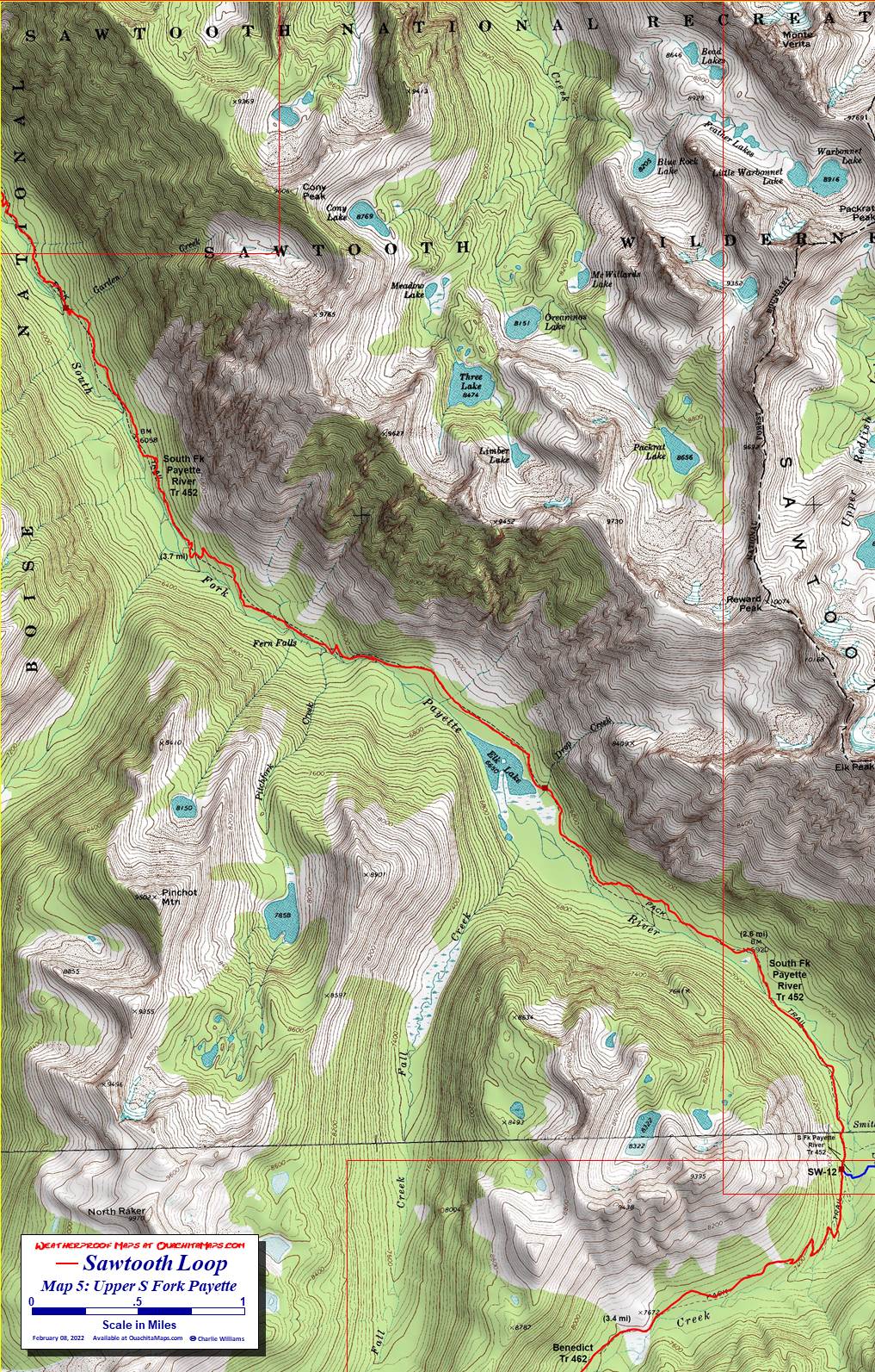 Map 4: Ardeth-Ten Basin-Benedict. The Mt Cramer Trail leaves Hidden Lake and switchbacks down to the SW-06 in the valley of the South Fork of the Payette River. SW-06 is 36.6 miles into the loop. The loop turns south-southeast (left) and follows the S Fk Payette River Trail (452. The trail is blue on the map but where it coincides with the loop, the red loop line makes it purple). Turning west (right) at the junction will lead to SW-12 in 3 miles, cutting 14 miles off from the loop.