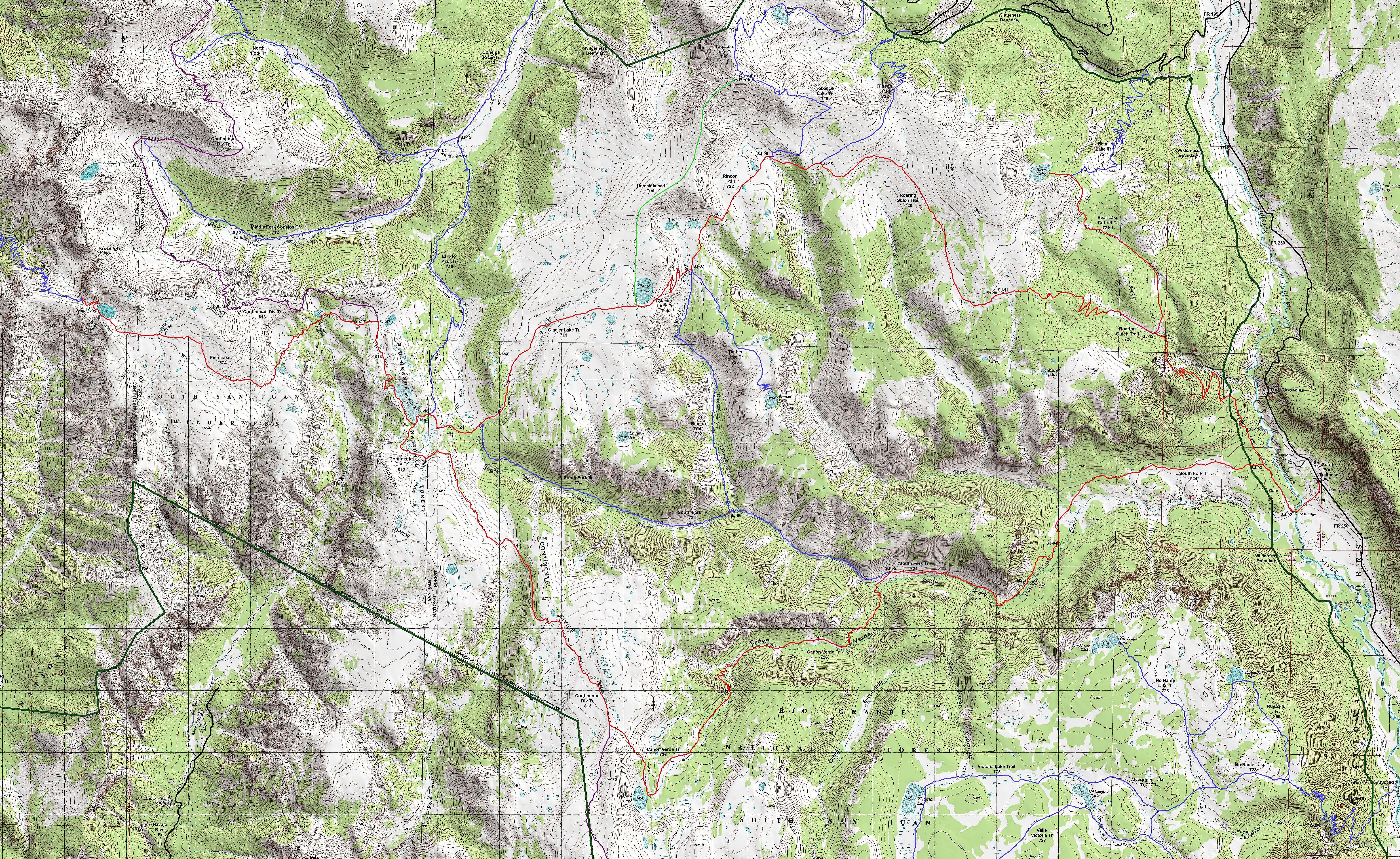 Info: USGS 7.5 minute Quadrangles: Summit Peak, Platoro, Red Mountain, Elephant Head Rock, Victoria Lake, and Spectacle Lake. Rio Grande National Forest, 1803 W. Highway 160, Monte Vista, CO 81144, Telephone: 719-852-5941..