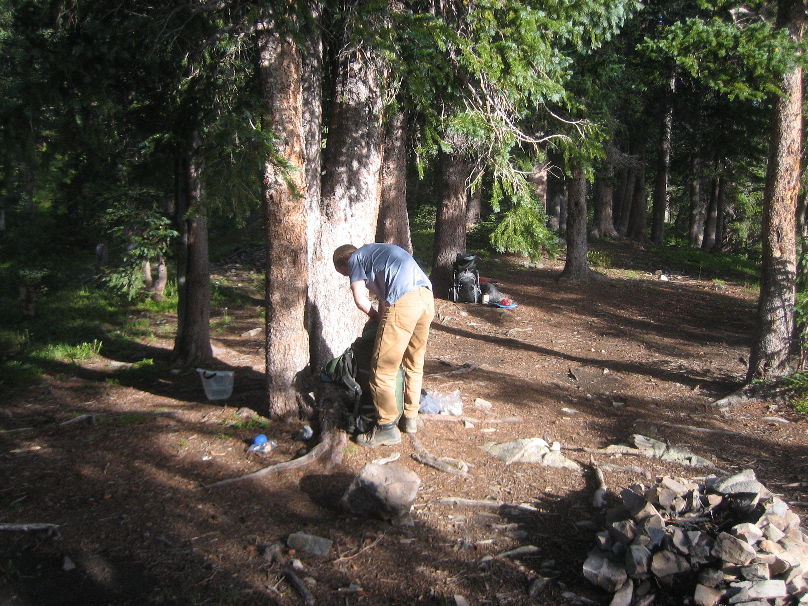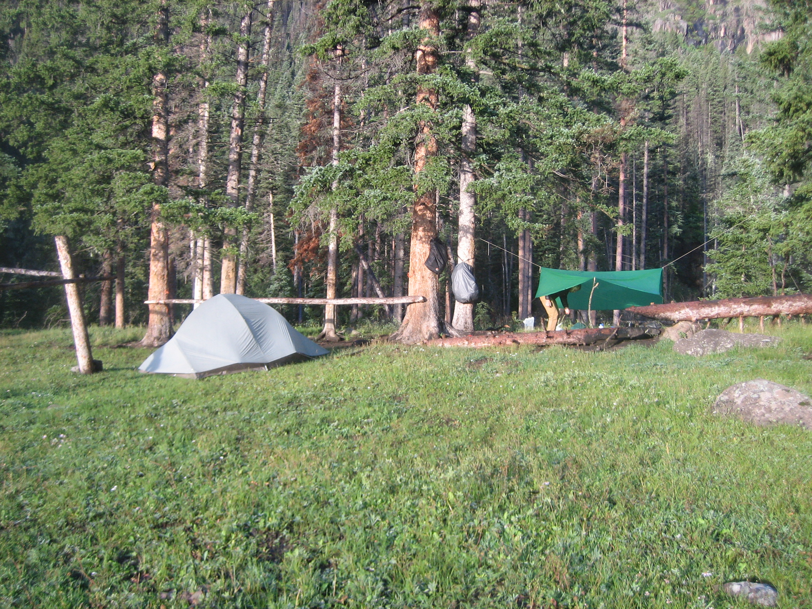 At SJ-05 (5.9 miles), Trail 726 takes off to the south, crosses the South Fork and heads up Canon Verde. The weather had been threatening so we made our first camp near the junction and set up the tarp. Good thing, too, because the rain came hard.