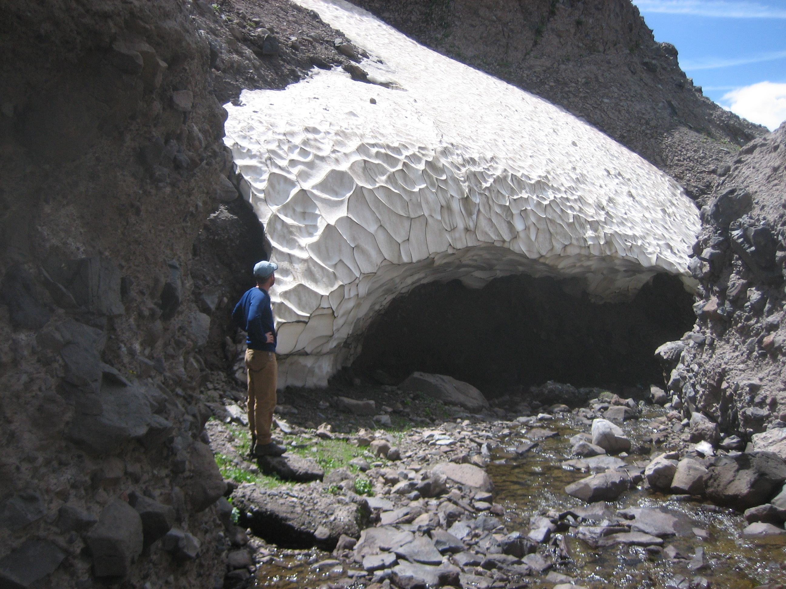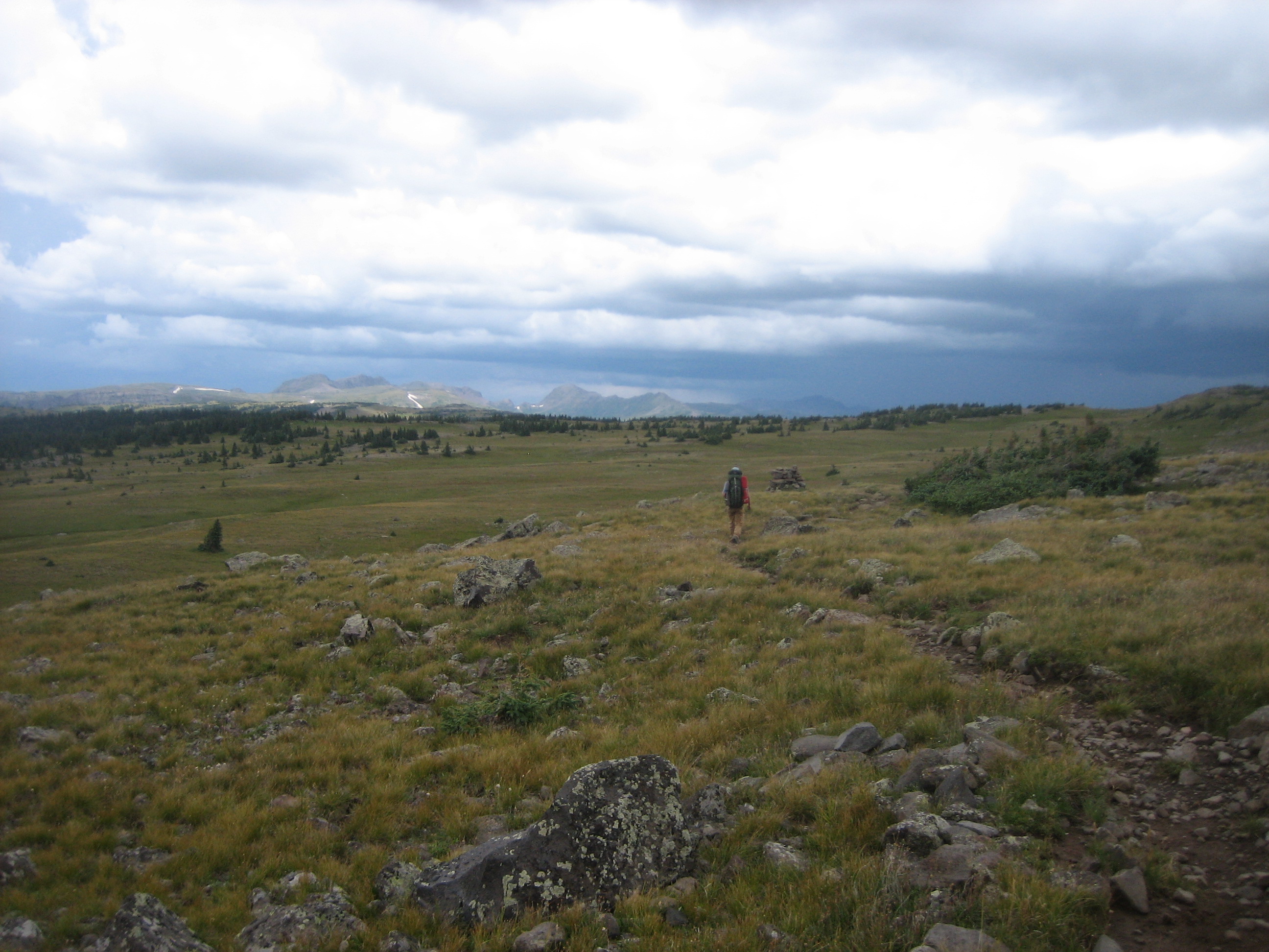 Fish Lake is nestled in a cirque bowl that drains to the south into Fish Creek, which in turn drains to Rio Blanco. The area around Fish Lake is above the timberline, rocky and barren of trees. We hiked around it looking for a campsite getting an up close view of Gunsight Pass (video) and running across a cool snow bridge. Since we had been getting a lot of rain and hail, we decided to back track a couple miles to an unnamed lake that had some trees so we could set up the tarp (video). Good thing, too, because the rain came again.