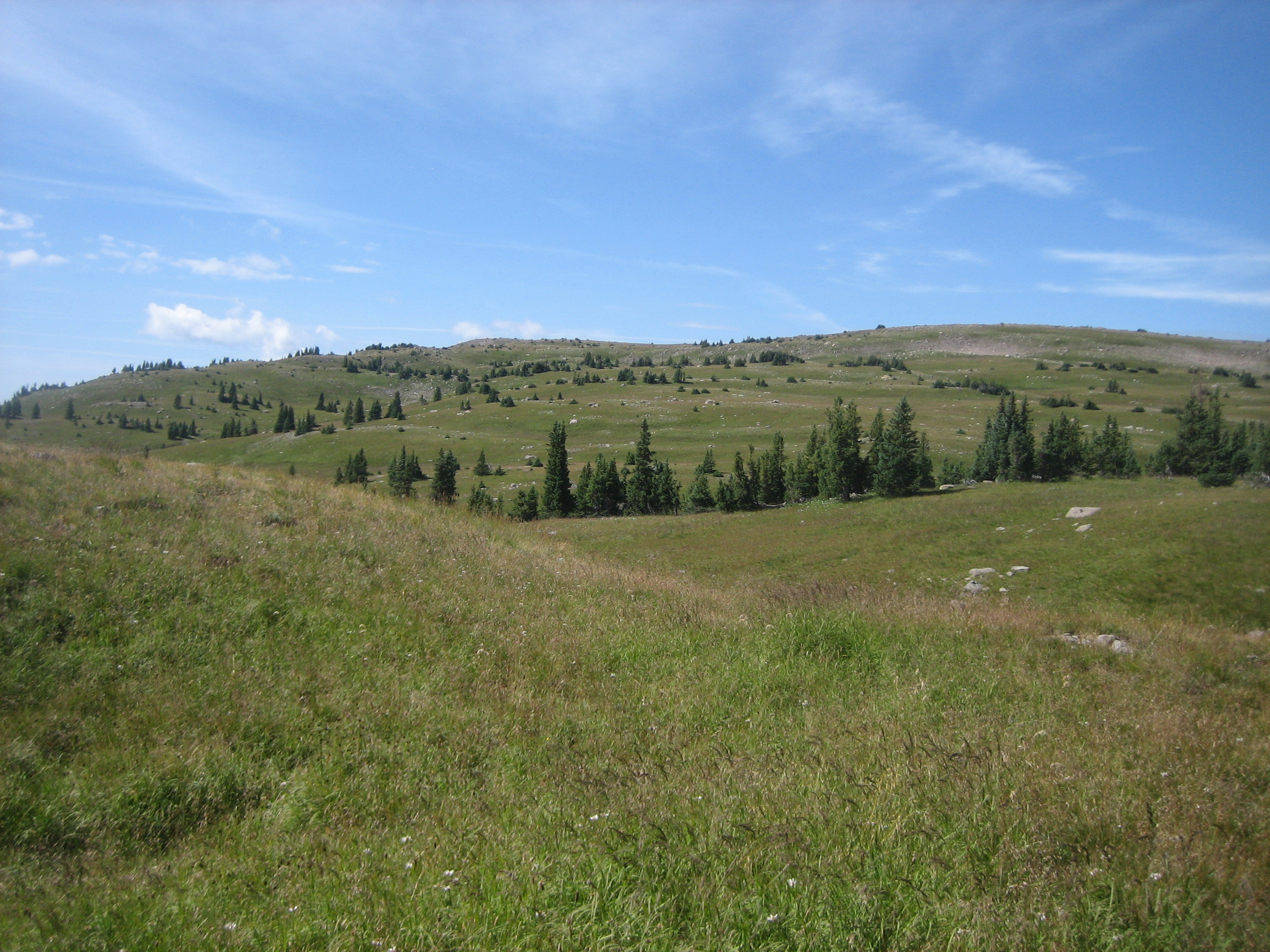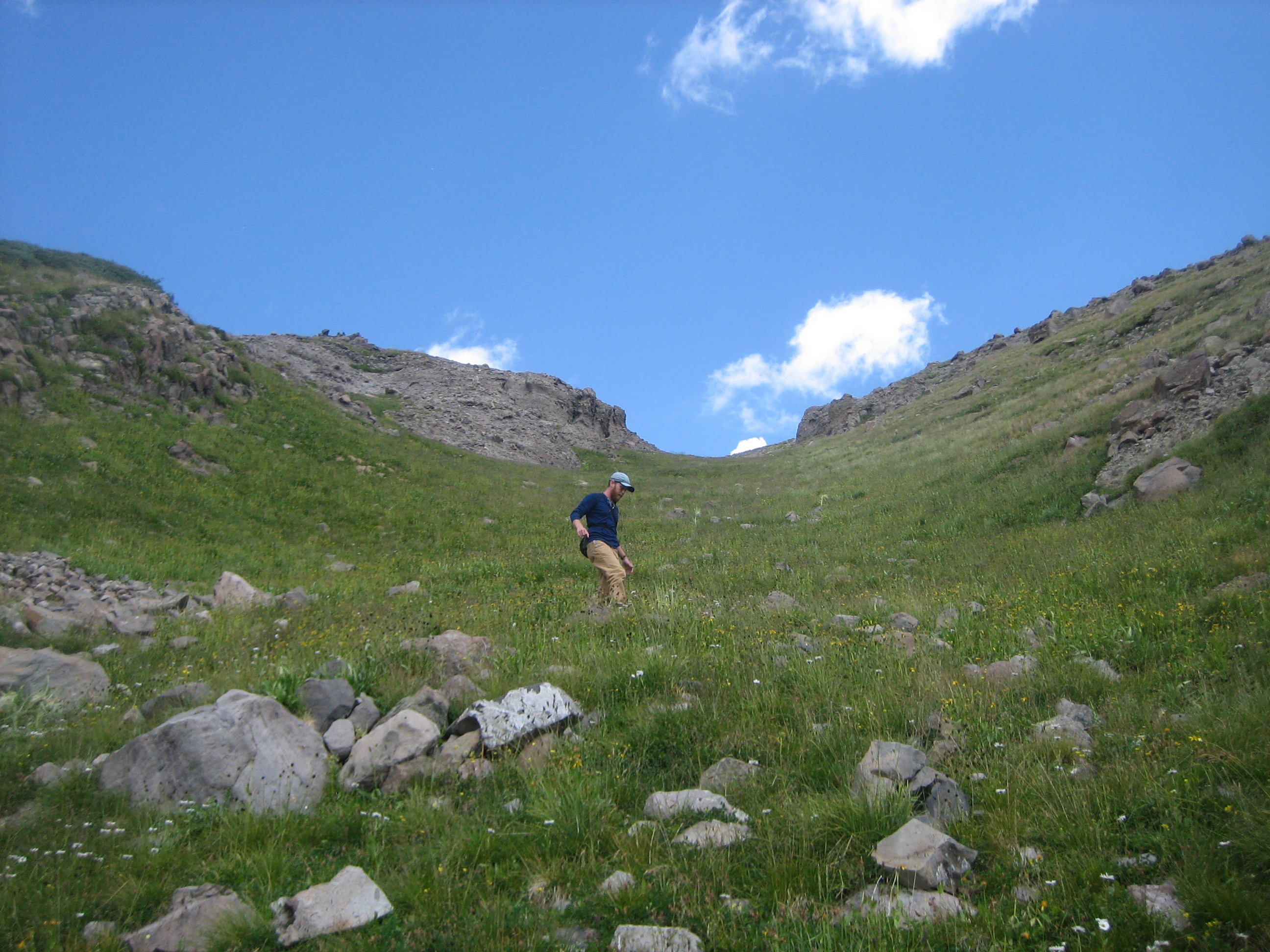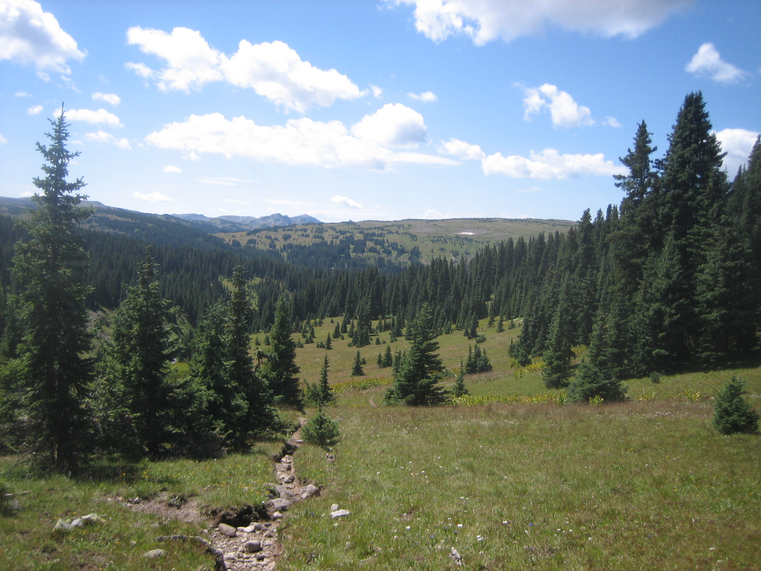 Sign in at the registry at the south end of the parking lot (SJ-01, 0.0 miles) and begin walking down hill on Trail 724 to the Conejos River. While the trail is not blazed, the path is usually evident. This won’t be the case if there is a lot of snow pack.Cross the bridge over the Conejos at 0.4 miles and reach the South Fork sign (SJ-02, 0.4 miles). In front of you to the west is the vast grass covered valley of the South Fork. The trail veers north, heads up a slight hill, passes a gate (0.7 miles) and reaches the junction of Trails 724 and 720 (SJ-03, 1.0 miles). Turn left and pass the Trail 724 post. For the next several miles you will hike though meadows and small sections of trees. At 1.7 miles there is a distinct trail the heads straight up a small rise towards the trees. Cross Hansen Creek at 3.3 miles. When we crossed it in August it was a braided stream of cobbles with multiple channels and could walk across it.