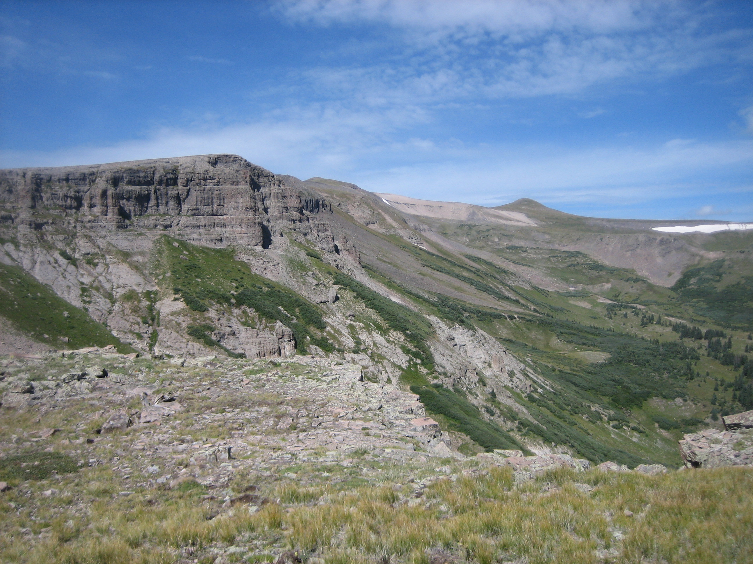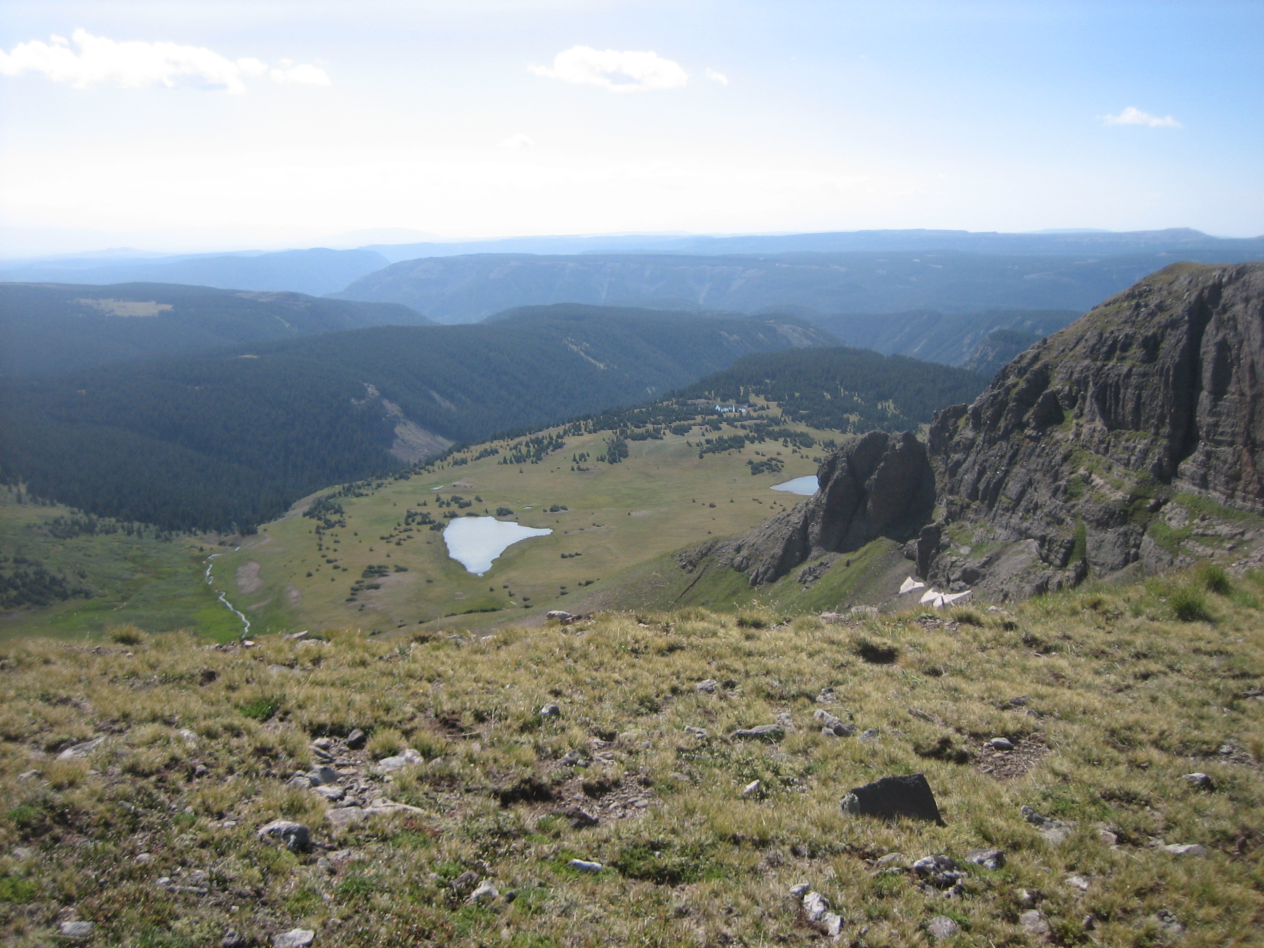 On Day 6 we hiked to Bear Lake. We took the Rincon Trail (video) for almost 3 miles looking for a trail marked as the Conejos Trail on the old topos. We hiked as far as the drop off and could see the upper cirque that holds Tobacco Lake. With some difficulty we found some intermittent treads but mostly went cross country over the alpine. If we weren't looking for the old Conejos trail, I would have just set some waypoints or bearings and ignored any paths in the grass. The bearings of the old trail would be fine, just make sure you don't come in too far north and hit the cliffs over Bear Lake. Following the general route of the old trail, we worked our way southeast along the contour, crossed high over the drainage, worked out way down the nose and then went north along the foot of the hill until we reached the Bear Lake Cut-off Trail. The east side of the lake was in the woods and had a good campsite. The other sides were rocky and steep and not suitable for camping.