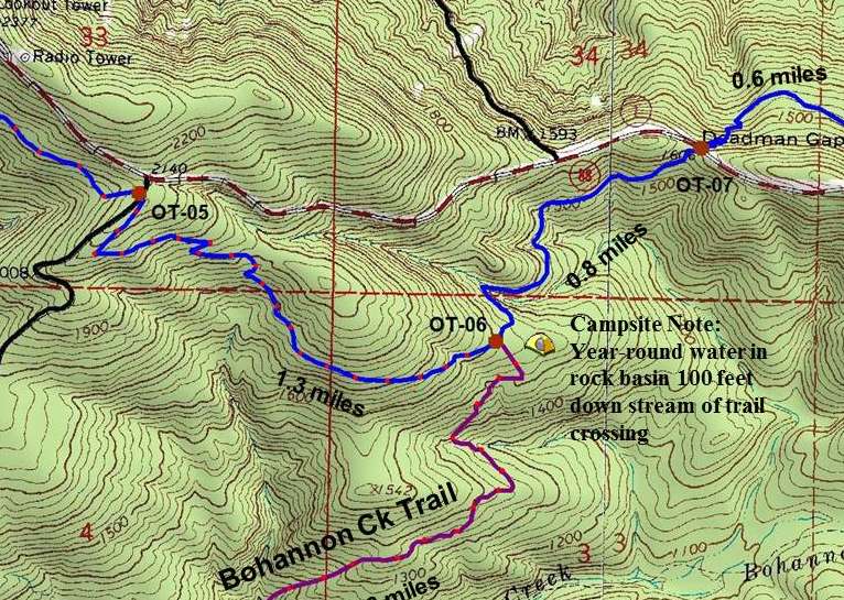 Just after a 200 foot climb, you will pass Panorama Vista Camp and then the Panorama Vista Spur Trail at 5.0 miles. The campsite has room for several tents but is dry. Cache water at Panorama Vista. At 5.7 miles cross FR 6010. The OT heads SW along the east side of the forest road for 0.1 miles and then turns east. A more obvious trail at FR 6010 is a multi use trail that heads ESE. It is broad but has no blazes. While I suspect this will intersect the OT near the Bohannon cut-off, I have never hiked it that far.