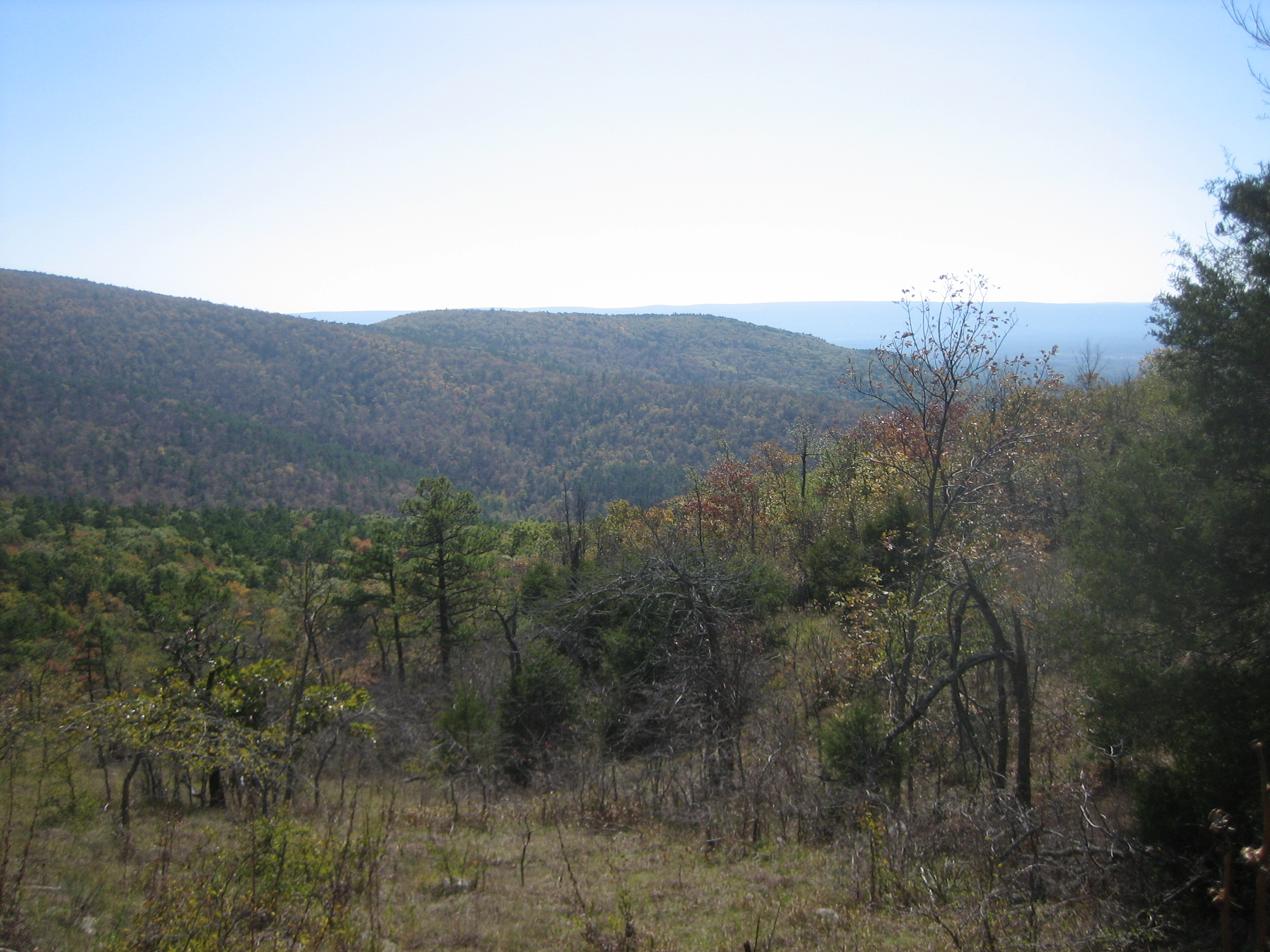 The Bohannon Trail is 1.3 miles from FR6010 on the OT. The OT continues past Bohannon Camp (a nice one tent camp site with year-round water in a rock basin down slope) and reaches Talimena Drive in 0.8 miles. Deadman Vista is just around the bend to the left (west). The Bohannon Trail is an 1.8 mile multi use trail that, quite frankly, is more like a rutted dirt road. It, however, is the key to making this a loop rather than an out and back or being dependent on a shuttle. Its other saving grace is a nice little outcrop near the bottom that overlooks Bohannon Creek.