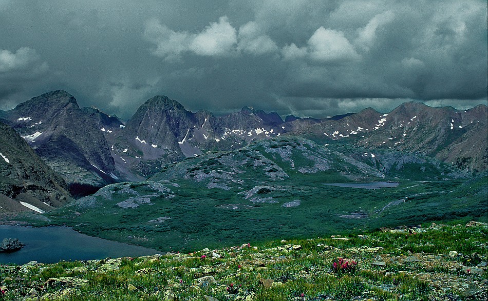 Stay on the CDT and descend to the Ute Basin. The basin is all above the treeline, with most of it above 12,000. It is covered with alpine grass, low shrubs and bare rock. Just before reaching Ute Lake, the Flint Lake Trail (#525) comes in from the south. We took it about a half mile to the first Flint Lake and set up camp (this one mile round trip excursion is included in the total trip mileage). There are great views of the unnamed peaks south of the Flint Creek valley. Back on the CDT, cross above Ute Lake at about 12,000 feet (mile 16.7).