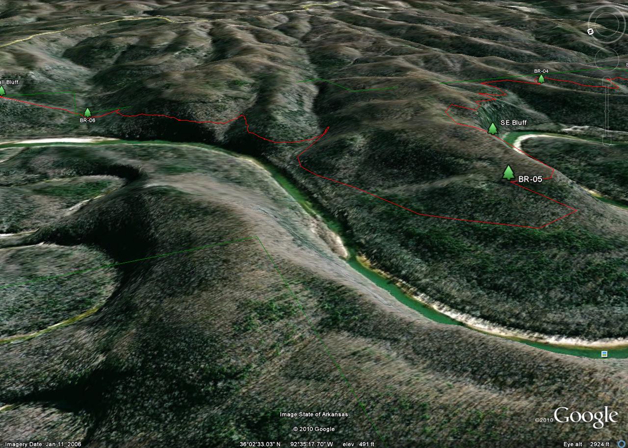 The tracks were taken in 2010 by a team consisting of Ken Smith, Bob Miller (Green Country Outdoor Club) and Rick Davis. The trail is in red and the Buffalo National River is outlined in green. Waypoints are designated with a maroon dot and labeled BR-xx. The mileages shown are between waypoints.