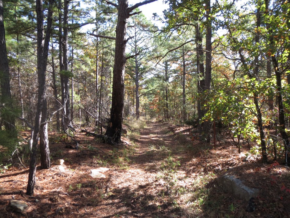 Ecology: The native Ouachita ecosystem is a pine-bluestem assemblage consisting of oak, hickory, shortleaf pine and bluestem grasses. In many parts of the Ouachitas, the pines were logged to near extinction. The National Forest Service has a program to restore the original ecosystem but has a long way to go. The McGee Creek area is different. I don't know if it is due to the fact that it is Bureau of Reclamation land rather than national forest, but this is the best example of the pine-bluestem ecosystem that I have seen. While there are plenty of oak and hickory (tons of hickory nuts on the ground this time of year), I would guess that shortleaf make up around 40% of the trees. The long and short bluestem grasses were present under canopy, in little glades and in the larger meadows such as south of Wildcat Canyon. The forest undergrowth has been managed with prescribed burns so the canopy looks and feels more open. I did a bit of bushwhacking while mapping and found it easier than anywhere else I've been in this part of the country. There many other forest treats that are only present in the fall. The beauty berries will stand out with their purple fruit, the trails were littered with hickory nuts, big green horse apples were present and there were lots of huge white mushrooms. There are also several native flowers that bloom in the fall.